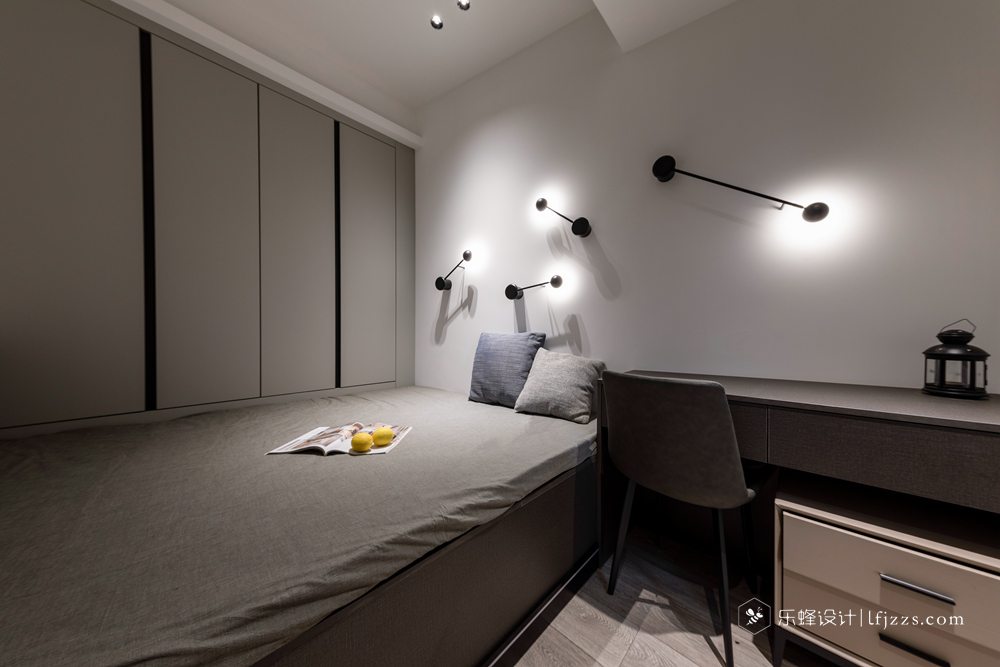次臥使用床跟柜子結合在一起,即美觀又可以達到更大的收納空間,墻面上面采用了一些簡單的小裝飾,使得墻面看起來簡約而不簡單,旁邊坐個一個小書桌,平時可以在這里看會書,辦會公,這樣也更加的安靜。