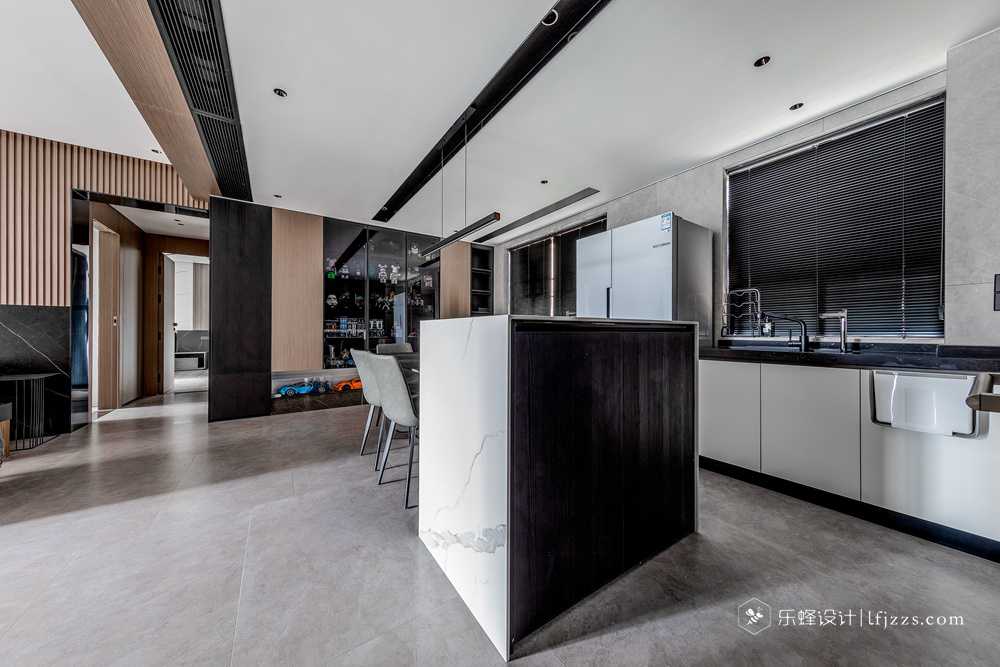 廚房是開放式的廚房,中間凸起部分的墻體采用灰色瓷磚,既遮蓋了戶型墻體的凸起異樣感,又利用黑白灰的特性讓空間看起來更加的高端。