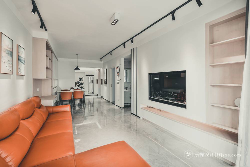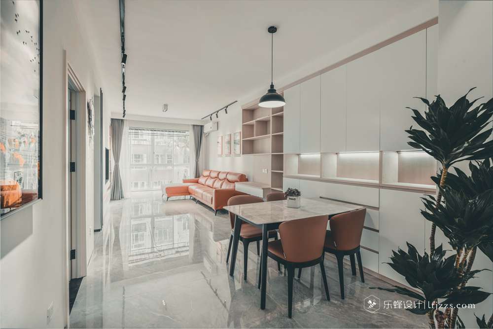 色彩簡(jiǎn)約,空間以白色為主基調(diào),摒棄傳統(tǒng)的吊燈,使用點(diǎn)光源的筒燈,使燈光更有層次感,整個(gè)空間的燈光也更柔和。再搭配橙色點(diǎn)綴,來(lái)引入一種時(shí)尚感。