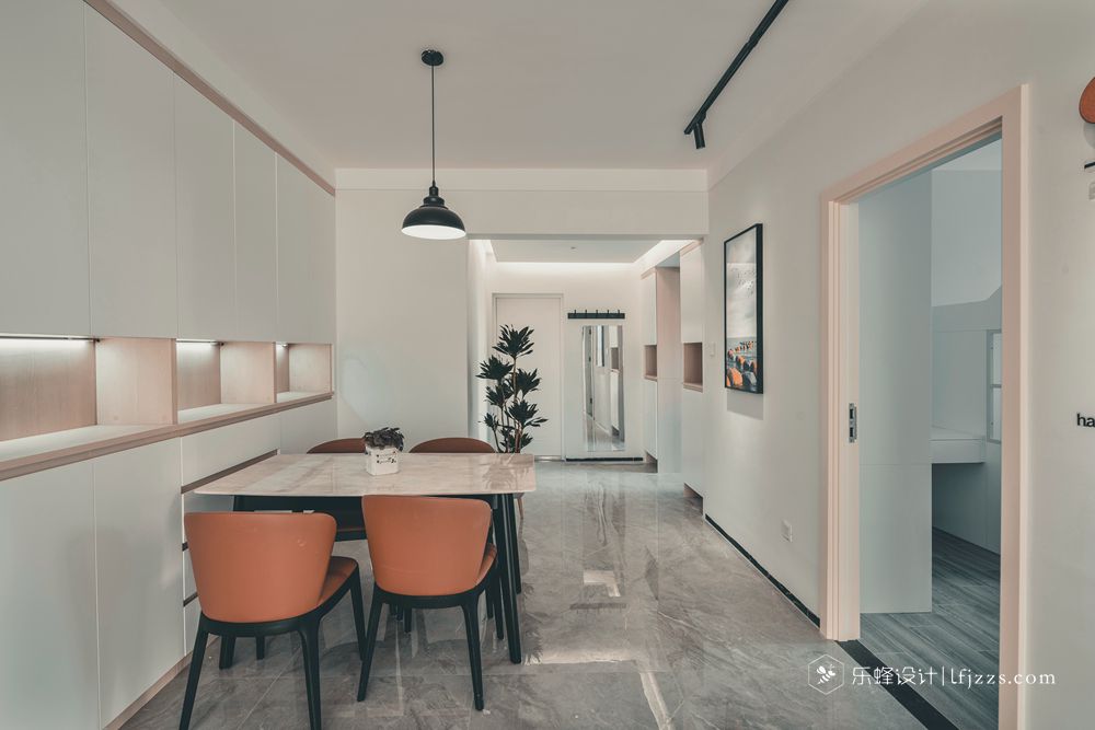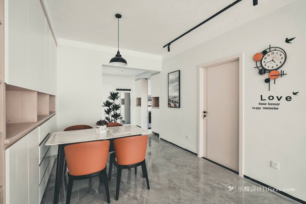 餐廳的墻面做了一整排的收納柜,滿足日常生活收納需求。餐廳使用大理石桌面,耐用好打理。座椅采用深橙色,迎合整個(gè)空間的色彩。