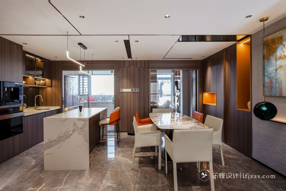 吧臺采用大理石與木色花紋的搭配,給生活的儀式感詩化為恰到好處的留白。一切顯得舒適而自然。
