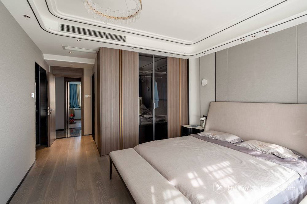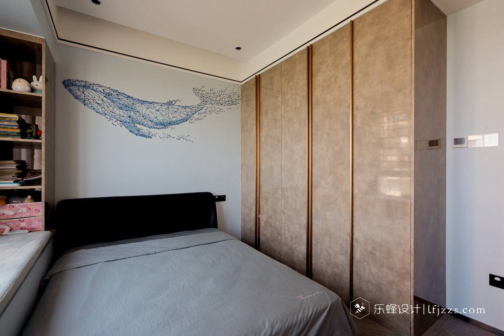 次臥整體設計的就沒有那么復雜,衣柜采用發光面與金屬感來承托出高級感,床品的配飾采用魚形元素串聯起空間的藝術想象,以打造低調輕奢的休憩空間。