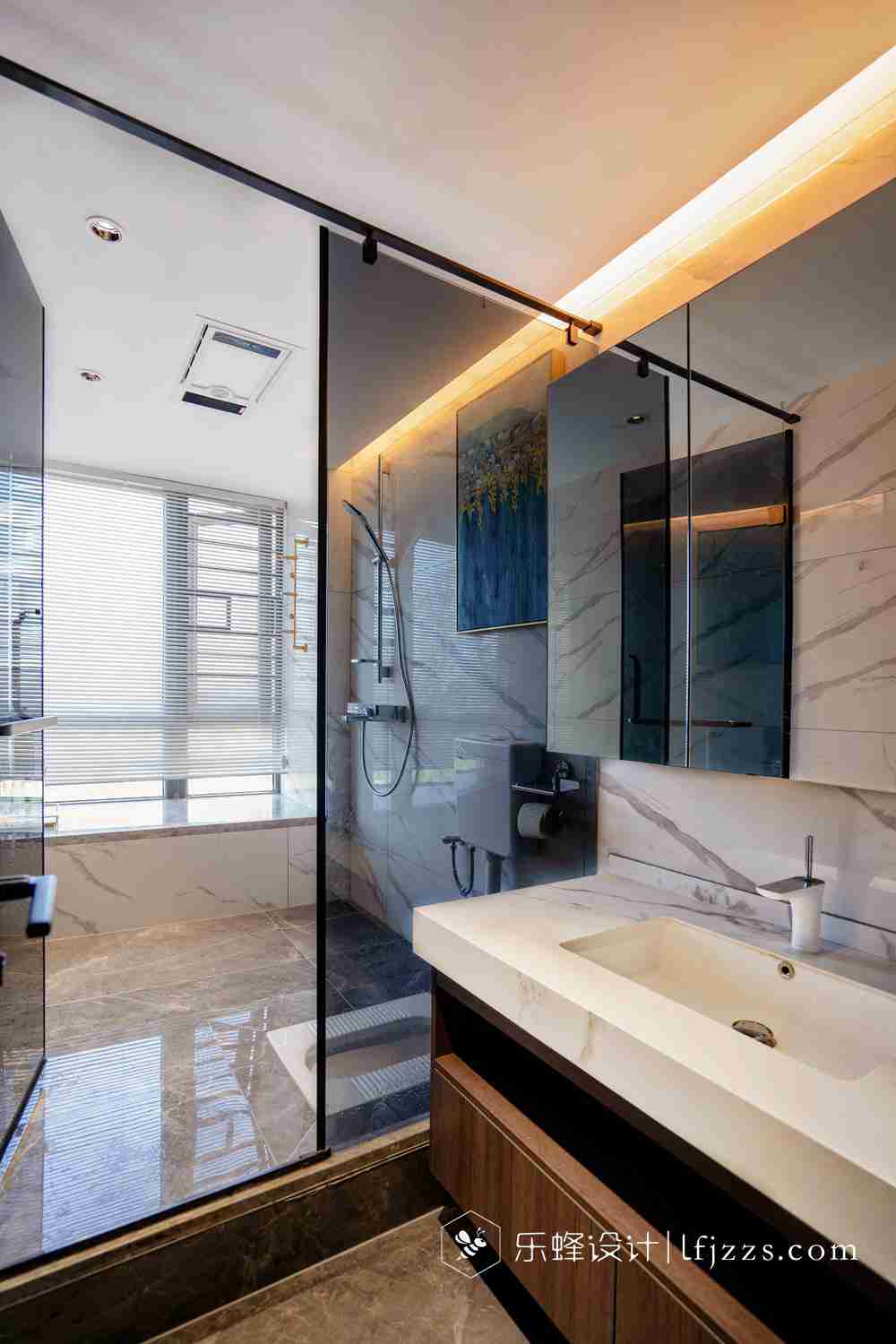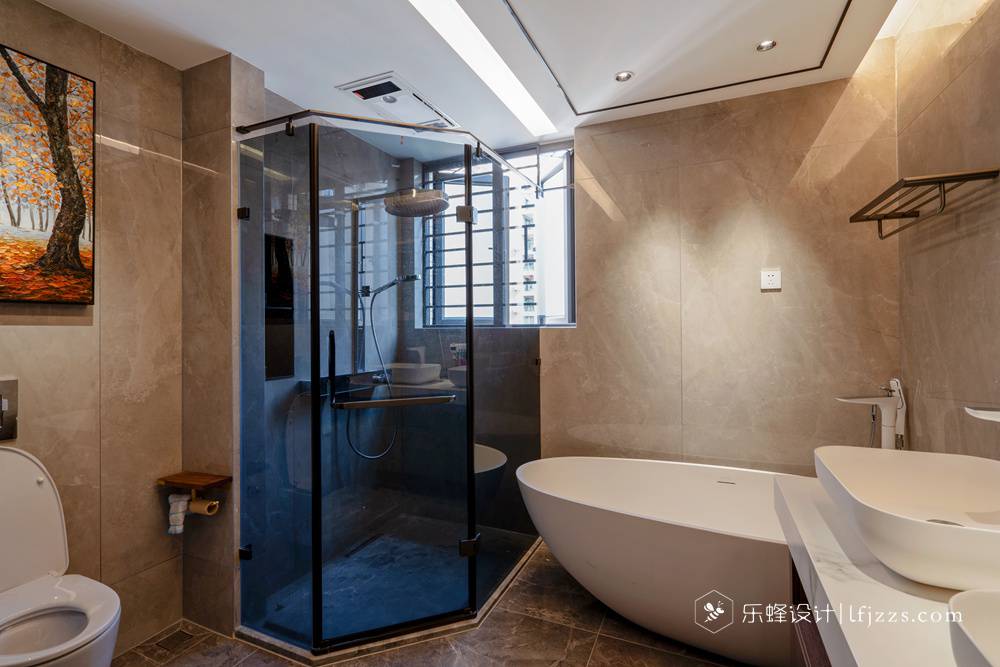 衛生間采用干濕分離,整體采用深色與白色花紋搭配,將輕奢展現的淋漓精致。