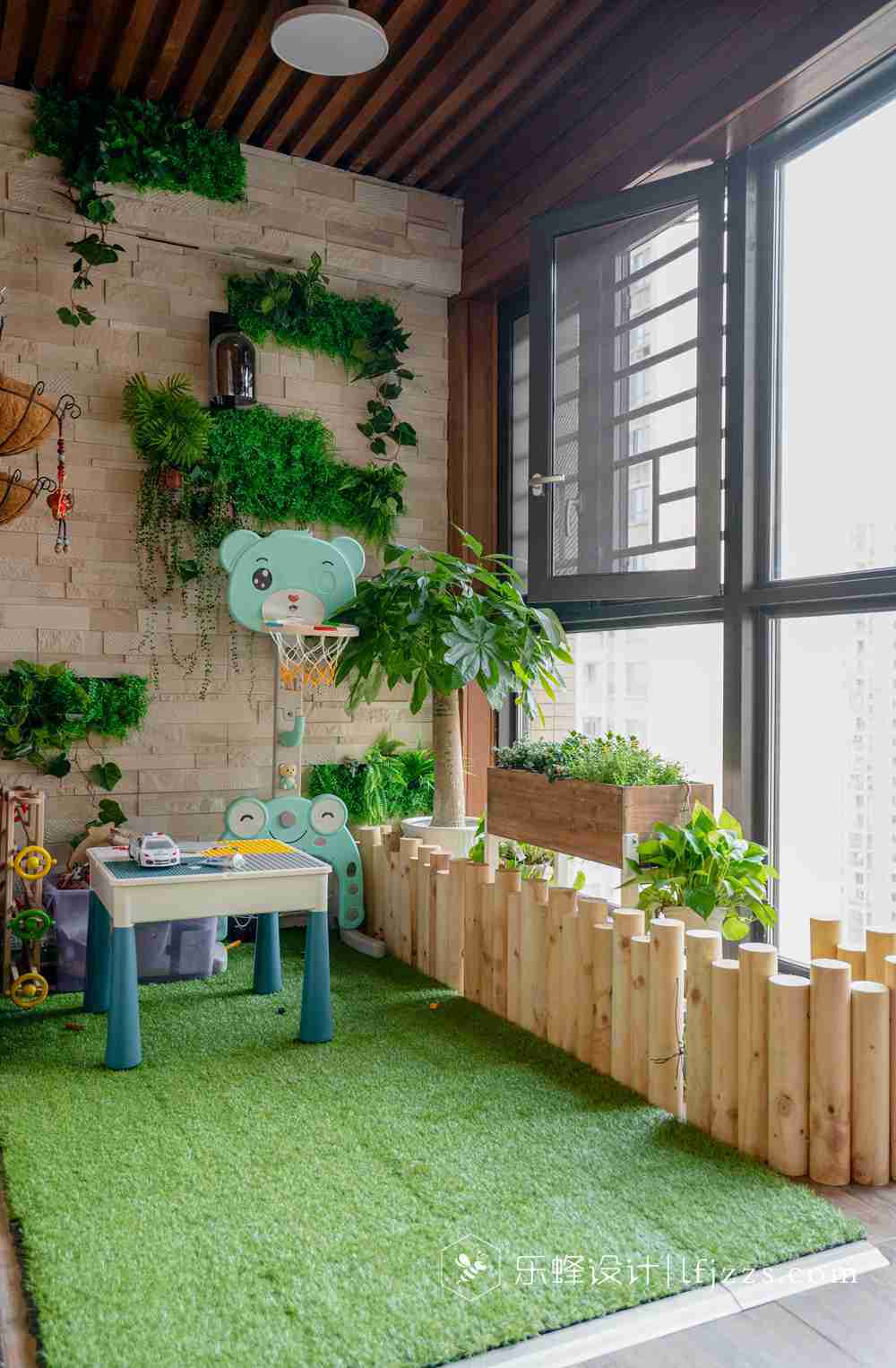 陽臺鋪上地毯,用植物搭配上,使得整個空間更加的有活力和生氣。在旁邊放上一些孩子的玩具,平時的時候可以在這個空間與孩子做一些互動。