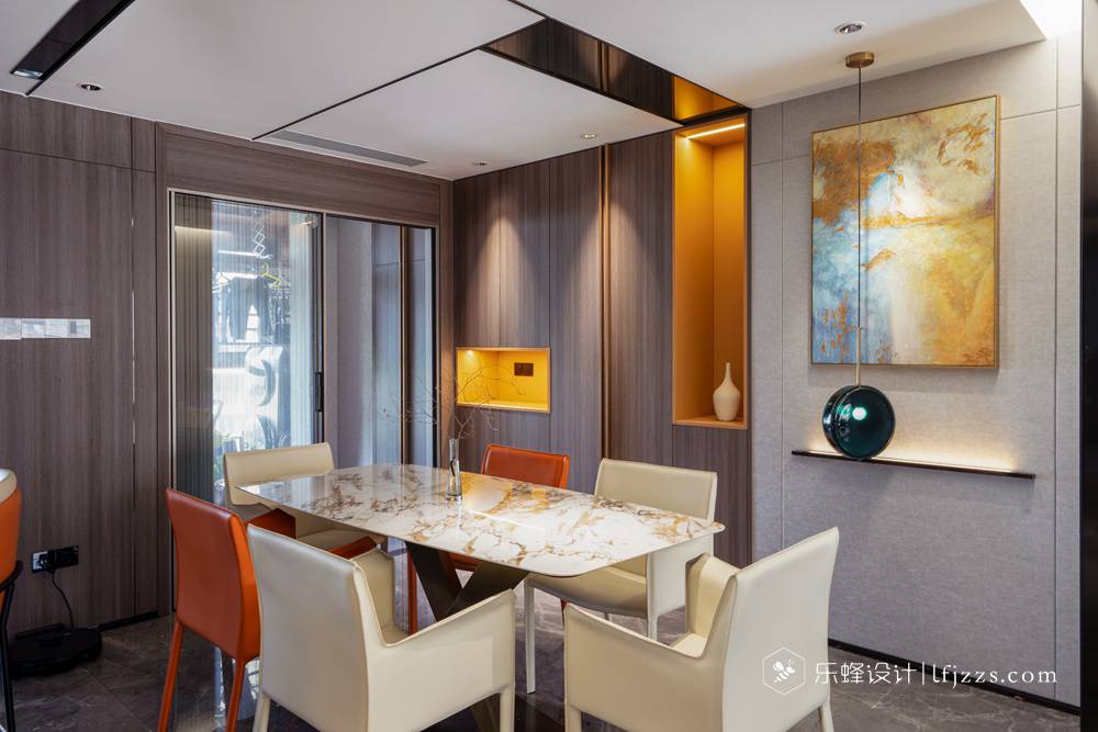 餐廳桌子采用黑金色花紋與大理石的結合,迎合整個空間的奢華感,凳子采用撞色,是的奢華中帶上家的溫暖氣息。