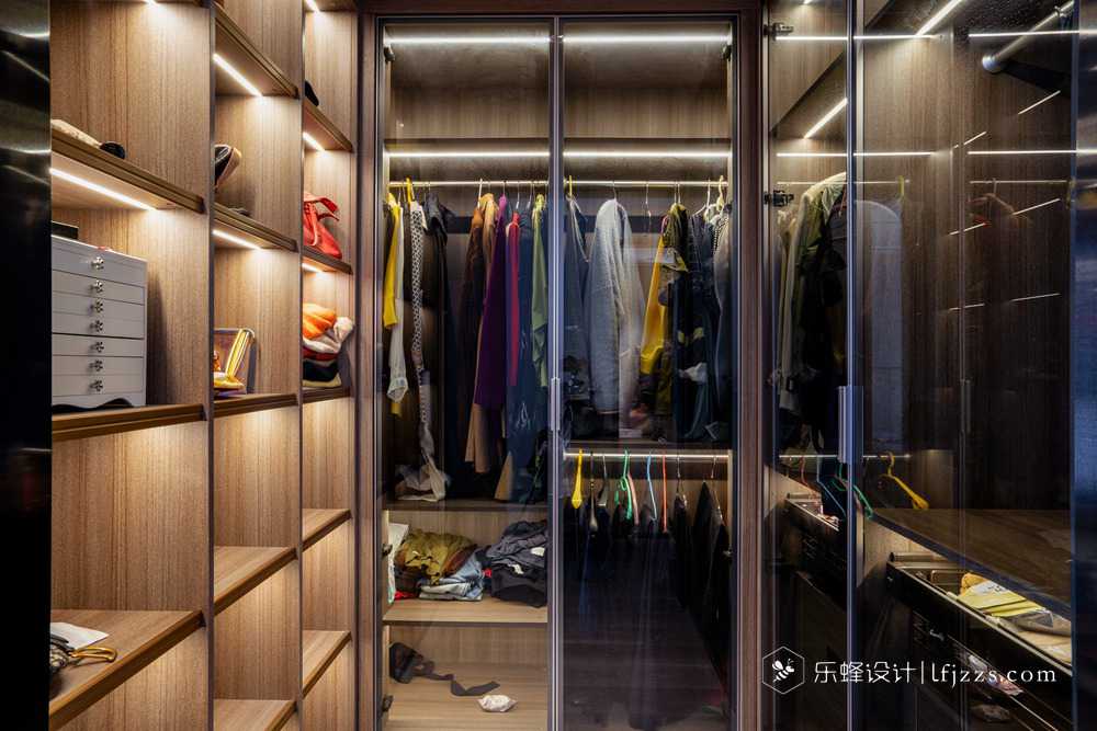 衣帽間采用了封閉式和半封閉式的樣式,一邊細分成一些小格子可以放一些小的裝飾和包包,另一邊采用透明玻璃,可以拿到自己想拿的衣物,在每個格子上面鑲嵌了燈帶,使得整個空間更加的高級奢華。