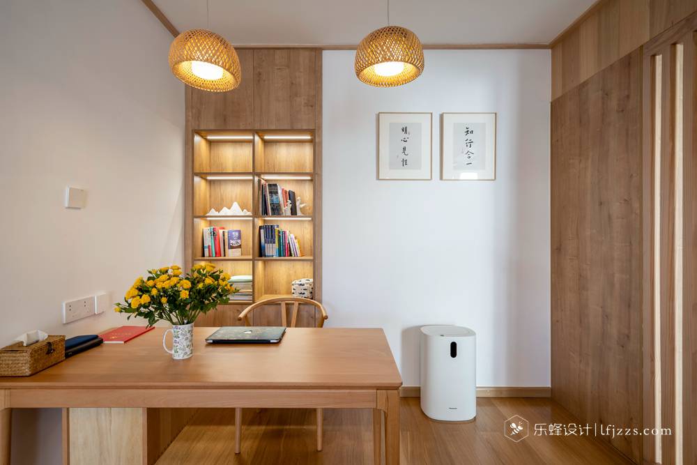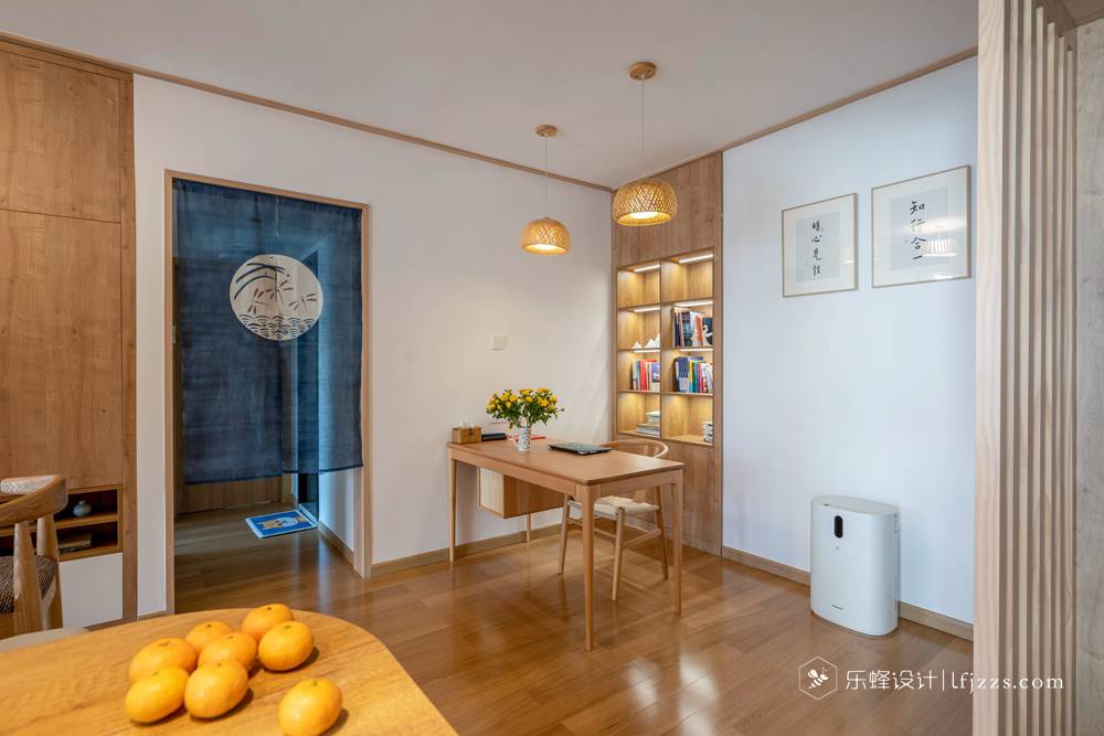 客廳一角設計開放式的書房,墻體非承重墻,所以做了壁龕式木質書柜,別致精彩;一張藍色卷簾仿若畫卷,成就空間的點睛之筆。