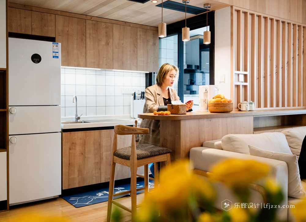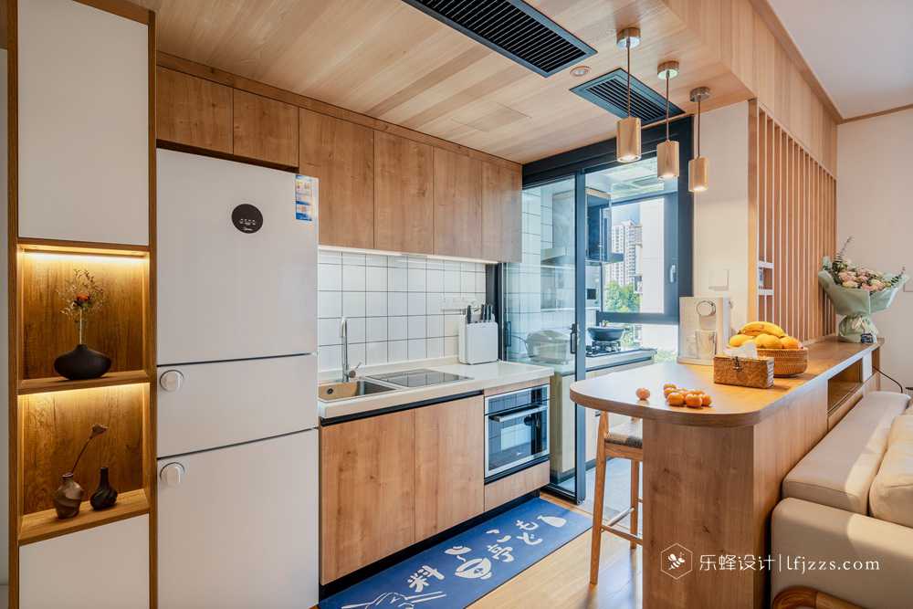 冰箱嵌入柜體中,尺寸恰好與櫥柜持平,整體空間視覺效果清爽舒適。餐桌擺脫傳統的方正設計,定制弧度吧臺式餐桌,靈活小巧,節省空間,完美詮釋日式設計的閑適。
