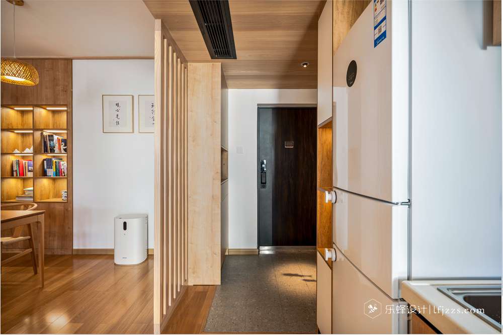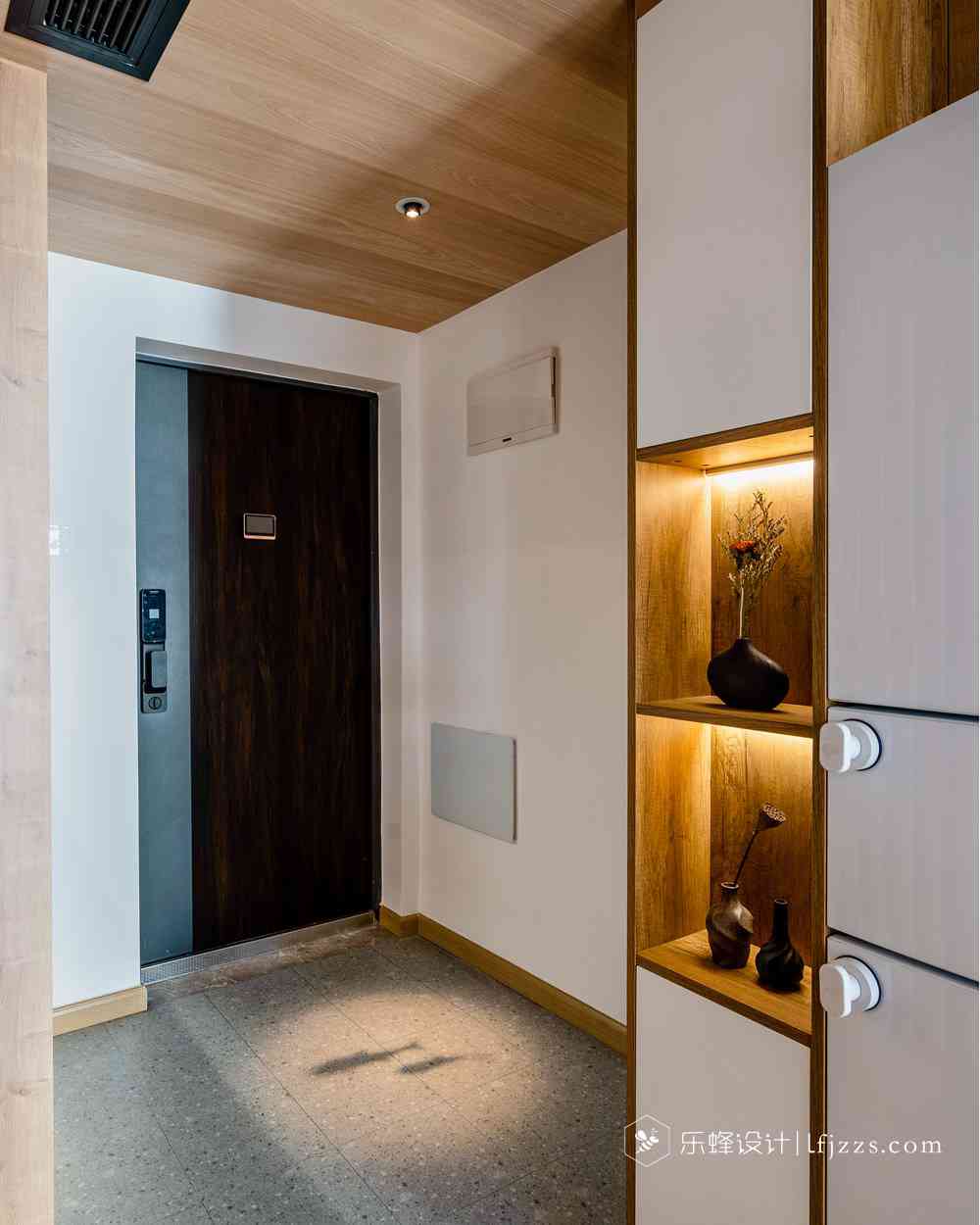 玄關處做了木質平頂,以及鋪設的地磚,在進門換鞋的地方方便打理。采用胡桃木儲物柜不僅可以遮擋廚房的視線,又能做收納與擺放裝飾品。