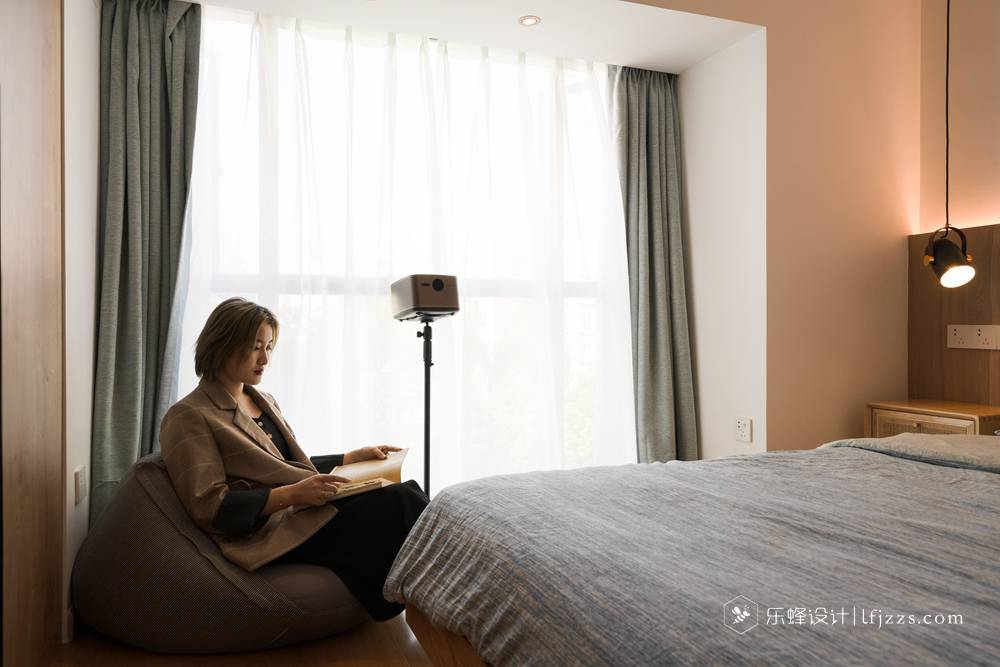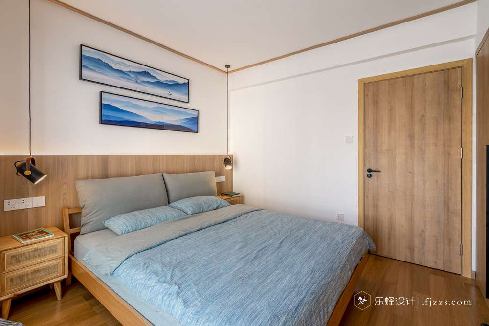 主臥床頭背景以原木風修飾,簡易布藝床體搭配,從色彩到工藝做到嚴絲合縫的效果。