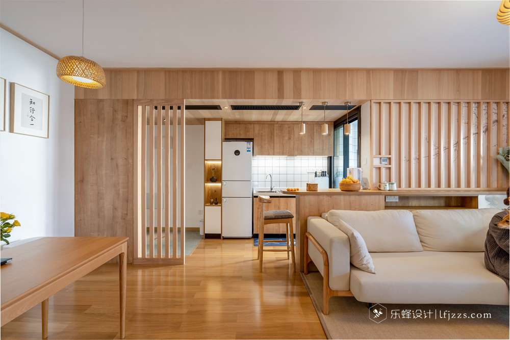 沙發座椅運用MUJI休閑風的搭配,與日式融合時強烈的治愈感,客廳就像生活中貼心的回憶與持續的歡樂溫暖的存在。日式原木風帶來的獨特的沉穩性格,讓居者感受恬靜氛圍。