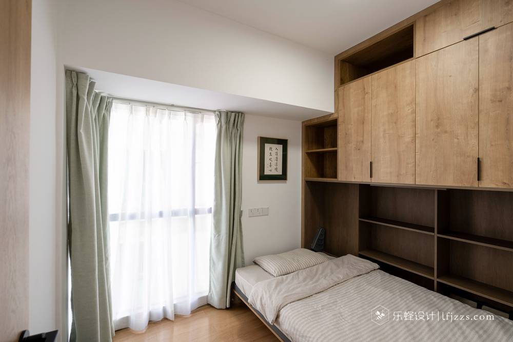次臥墻體打滿懸掛式柜體提高收納空間,用灰綠窗簾裝點空間,將沉穩的次臥區別開來,完美把握整體空間的平衡。