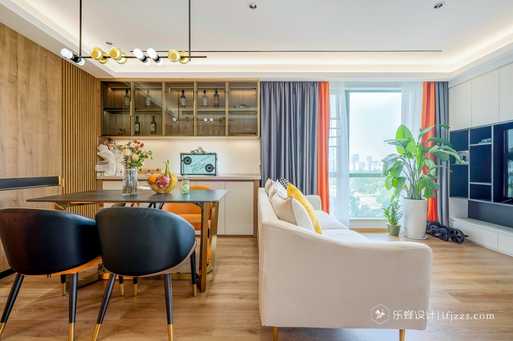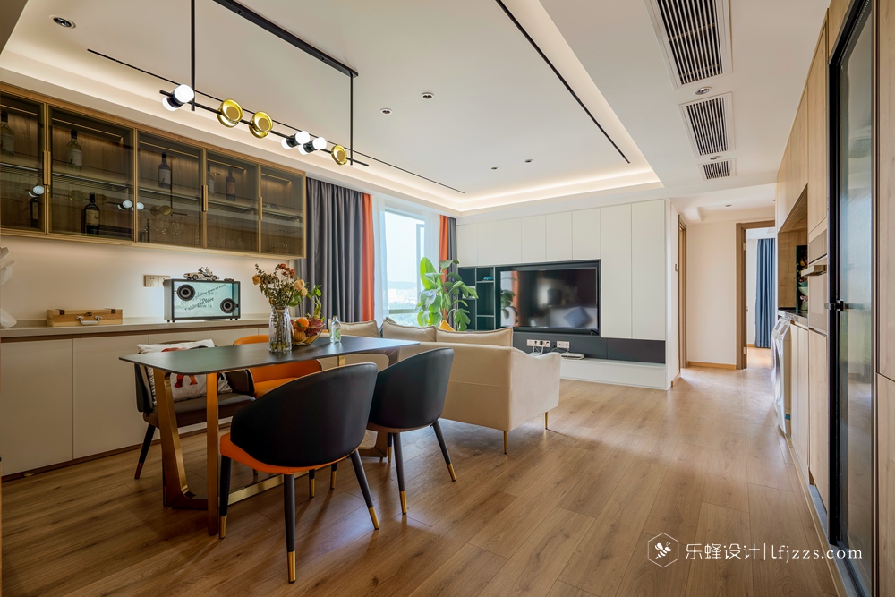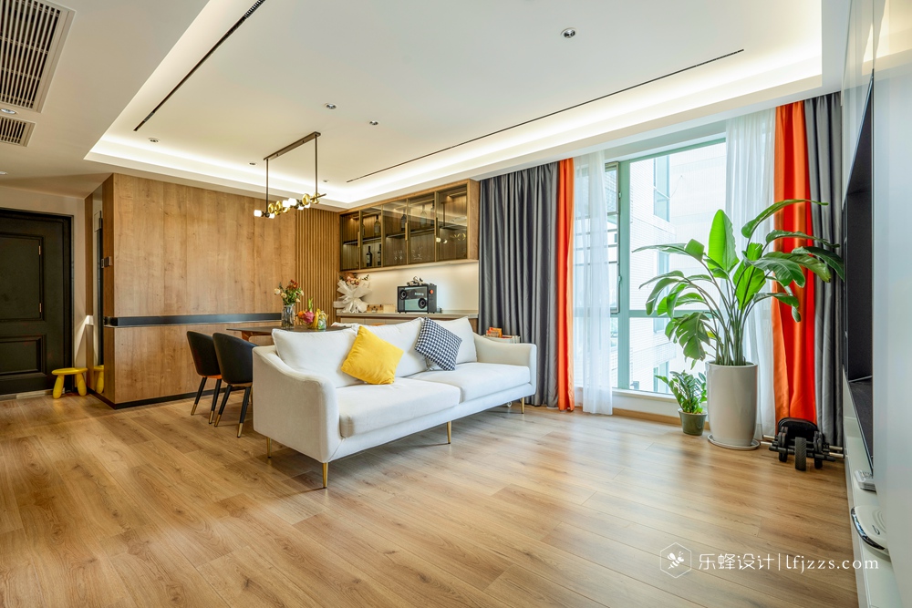 客廳采用無主燈設計,簡潔大氣,注重發揮空間結構構成本身的形式美,造型簡潔,反對多余裝飾,尊重材料的特性。
