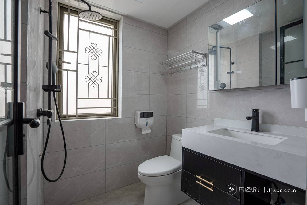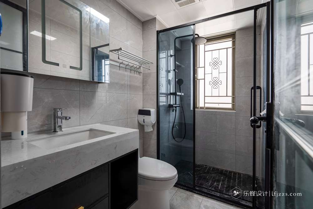 衛浴間的墻面和地面通鋪灰色大理石,沐浴區以透明玻璃門隔斷,做到干濕分離,通透明亮。