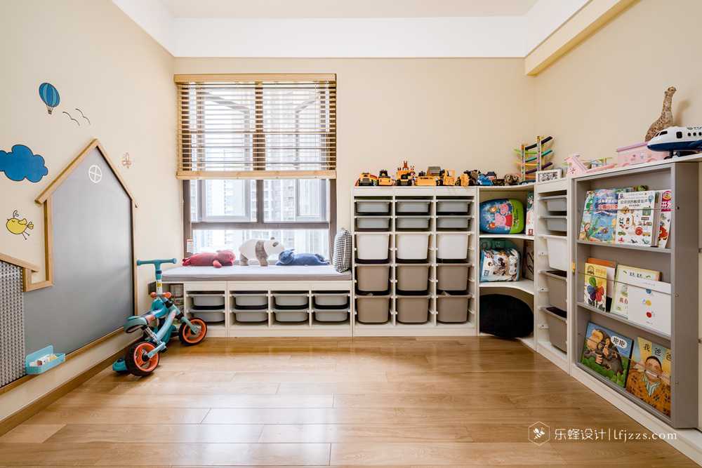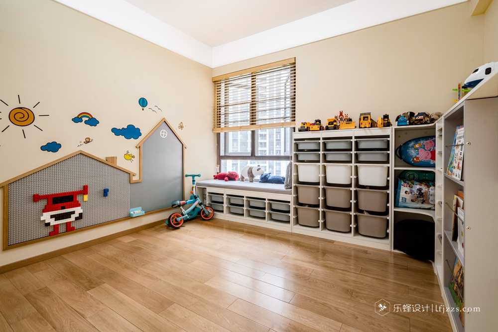 兒童房主要是用于孩子玩耍的一個空間,做了很多的柜子,把平時玩的一些玩具分開歸納,這樣既方便拿取也能培養孩子的一個收拾的好習慣。