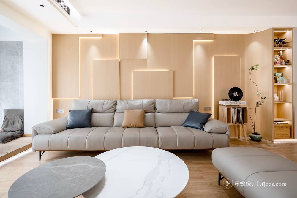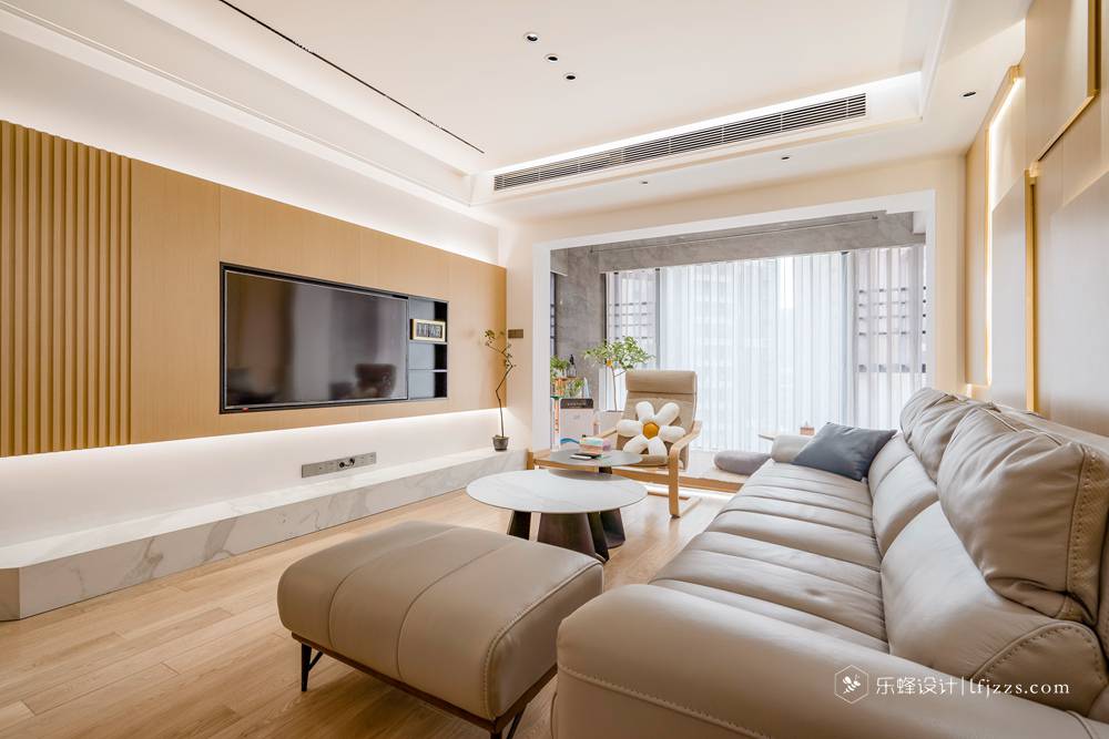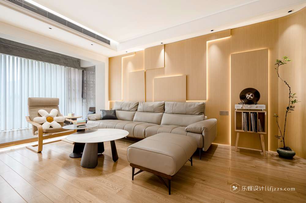 客廳整體基調以原木自然風為主,溫馨的燈光,搭配軟皮沙發,以及恰當的留白,植物作為點綴,營造舒適的居住氛圍。