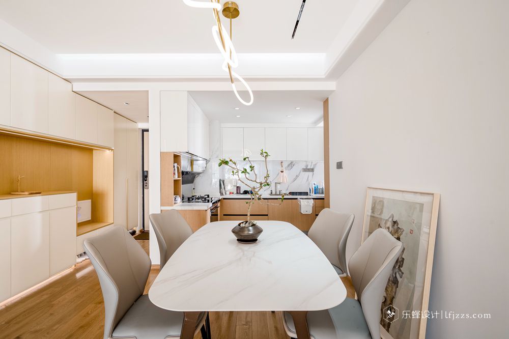 客餐廳一體,便于家人之間的互動交流。餐廳和廚房中間未設門,淡化了空間的界限,多出一份情調,讓空間承載更多親情時光。