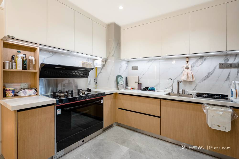 U型設計,灰白墻地磚搭配原木色櫥柜,使整個空間干凈利落。