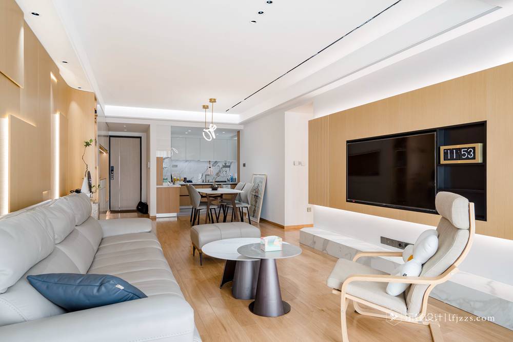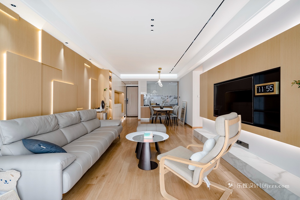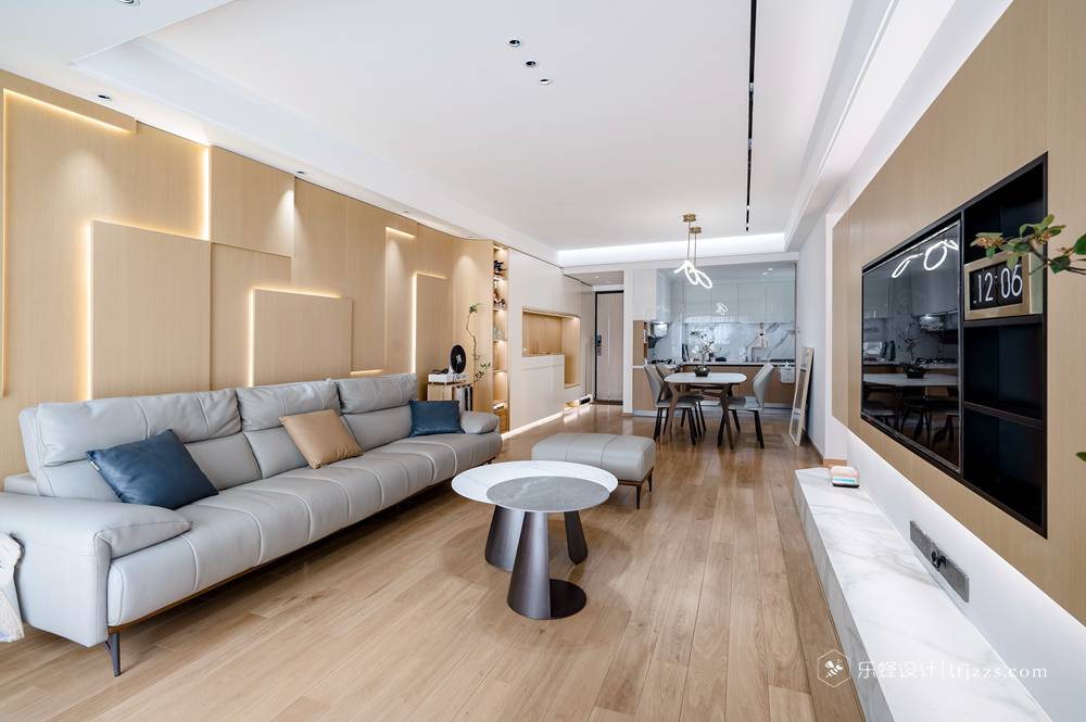 本案是一套龍光 · 玖龍璽120平四居室房子,采用日式原木風格,客廳、餐廳、廚房一體化,使整個空間更加寬敞明亮。