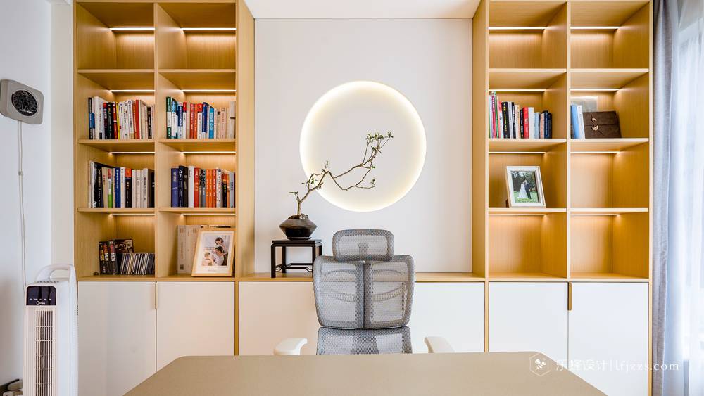 書房沿用整體的空間色彩原木風,沒有刻意的設計很多東西,在書桌后面設計一整排的書柜,方便平時的一些書籍拿取。亮點的話就是書柜中間用日式特點隔開,在放在一個綠植點綴,完美。