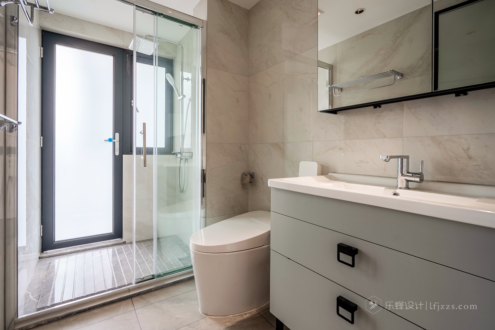 衛生間很好的做到了干濕分離,優化了凸出的承重結構,頂面的設計區別于很多業主,這里和廚房一樣都是在做了防潮的埃特板,防潮的同時也兼顧了整體性