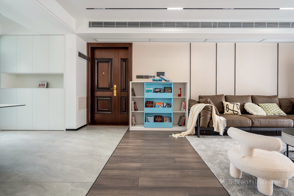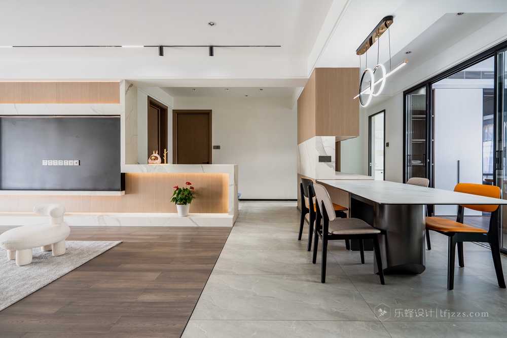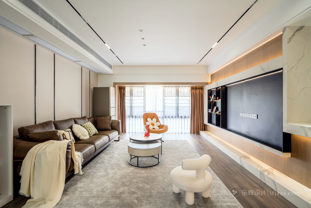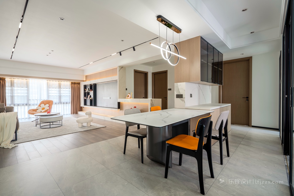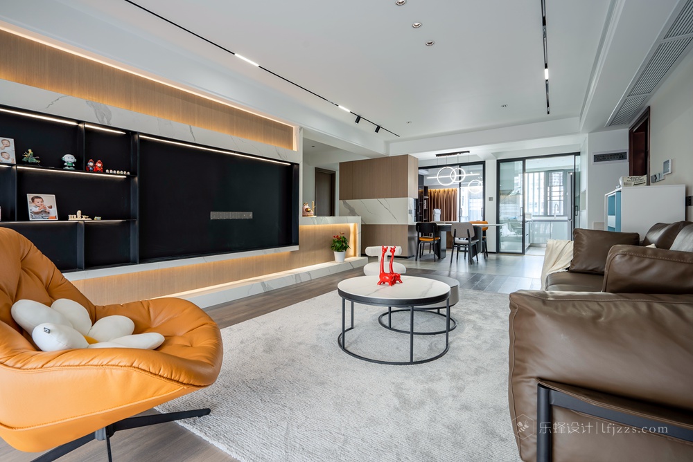 客廳因為和餐桌區域分開來,所以整體空間感更加好,無主燈吊頂在保證層高的前提下內嵌了線性燈和防眩筒燈模組,搭配墻面的暗藏燈帶營造出溫馨的風格