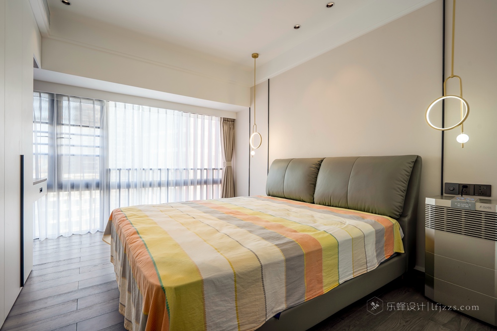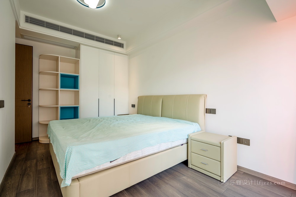 主臥作為主人休息的房間整體風格也是偏溫馨化的,整面的衣柜+書桌的組合增加了儲物空間,同時整體協同性也會更好
