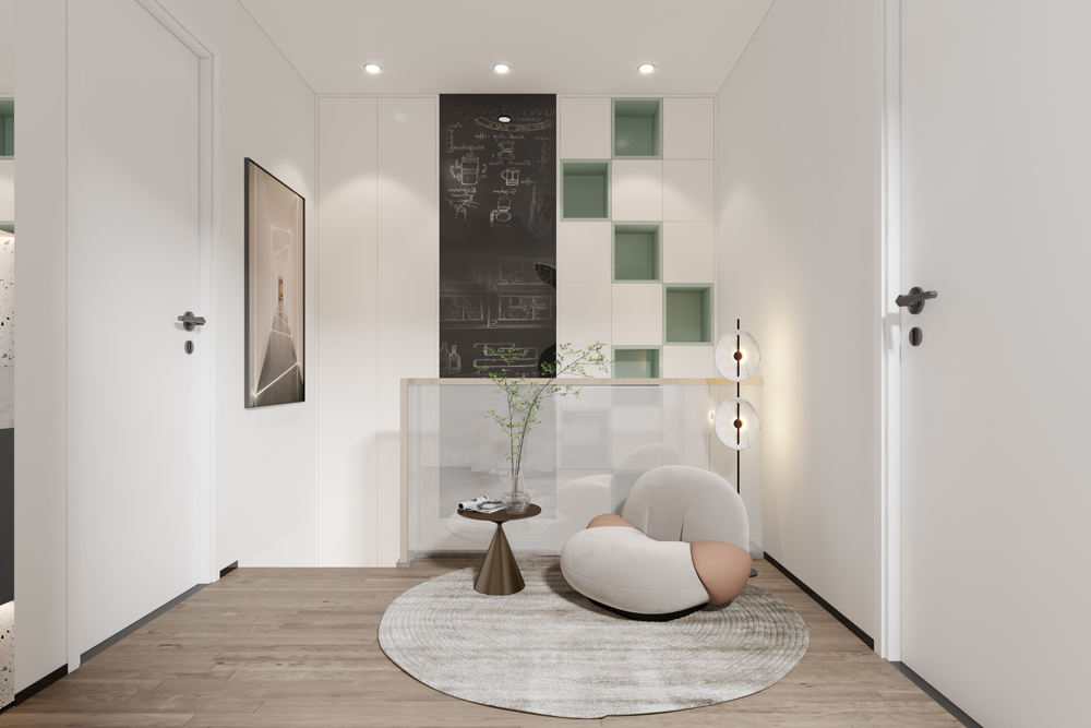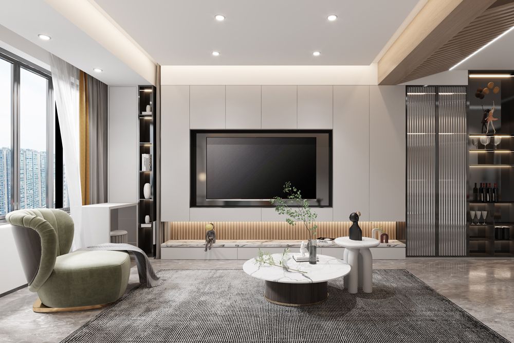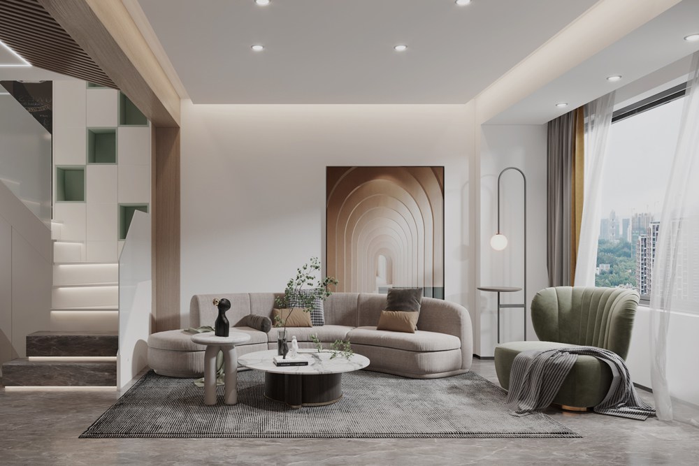 本案是一個(gè)小型復(fù)式房子,在低飽和度暖調(diào)的鋪敘下,設(shè)計(jì)采取不同層次的橄欖綠軟裝家具作為點(diǎn)綴,勾勒著簡約靈動(dòng)的空間氛圍。墻面的藝術(shù)掛畫與灰調(diào)的地毯形成對(duì)映,搭配極具藝術(shù)格調(diào)的裝飾小品、材質(zhì)柔軟的布藝沙發(fā)、圓形造型大理石茶幾,使空間呈現(xiàn)出和諧統(tǒng)一的當(dāng)代美學(xué)秩序。