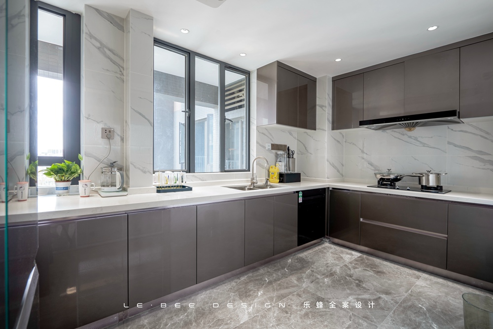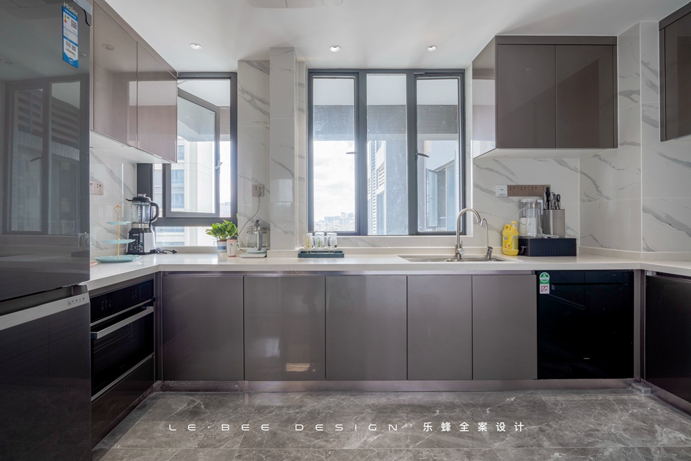設計師充分利用廚房的采光讓整體的使用感提升,與一般封閉式廚房不同的多采光形式給人的感覺不會如同常規封閉式廚房那么的壓抑。