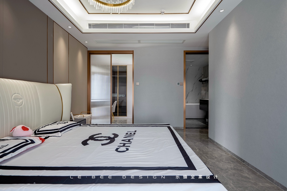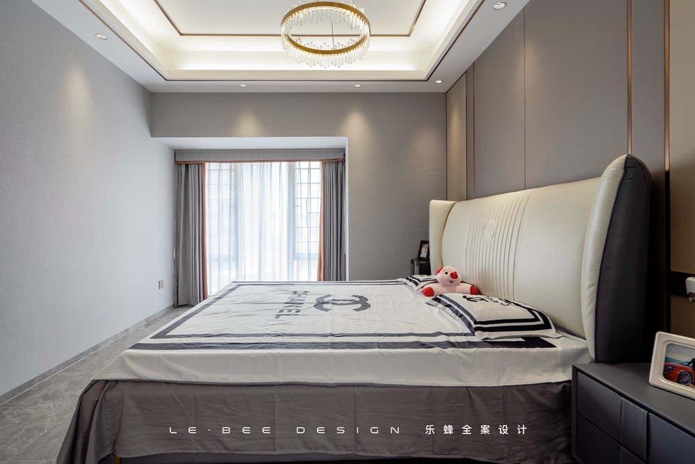 主臥的背景墻,選用軟包和金屬嵌條搭配,和其他區域風格統一,但又不失溫馨。2.4米寬的落地窗,讓房間更加通透明亮。