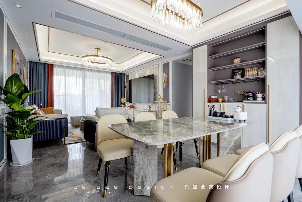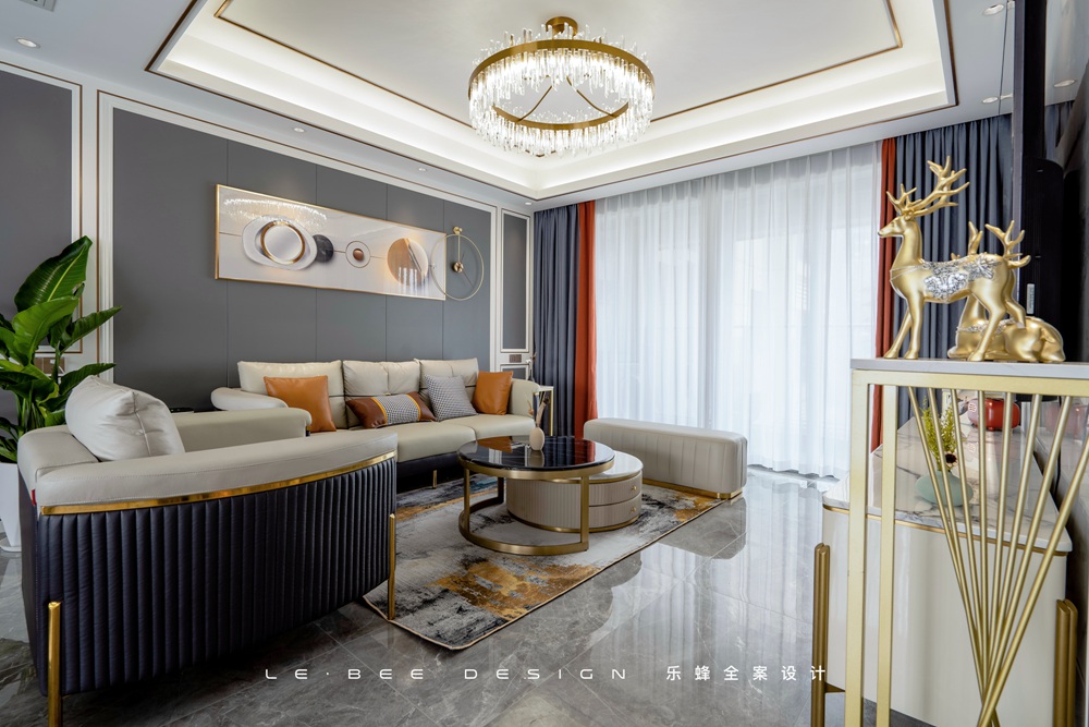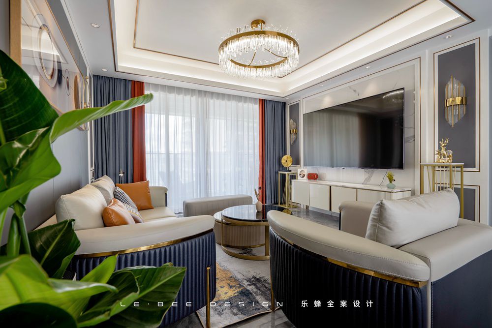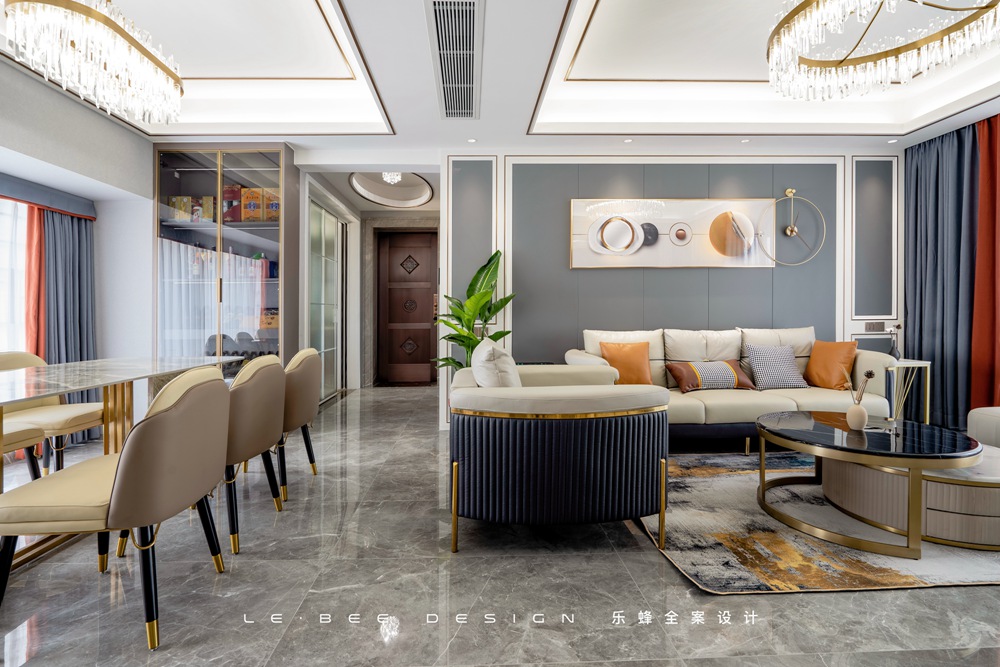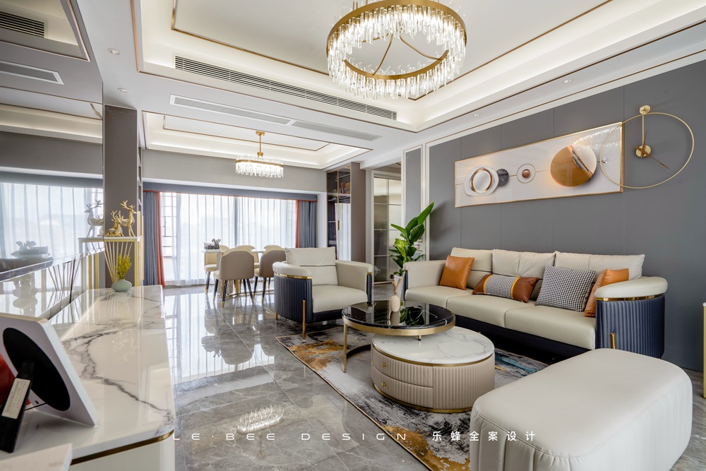 整體以白色、藍色、淺灰為基調,對稱的金屬線條勾畫了空間輕奢的輪廓,落地窗的設計促成光與摩登家具的極致配合,自然光與室內燈光相得益彰,溫馨、舒適、輕松感猶如一陣微風撲面而來。