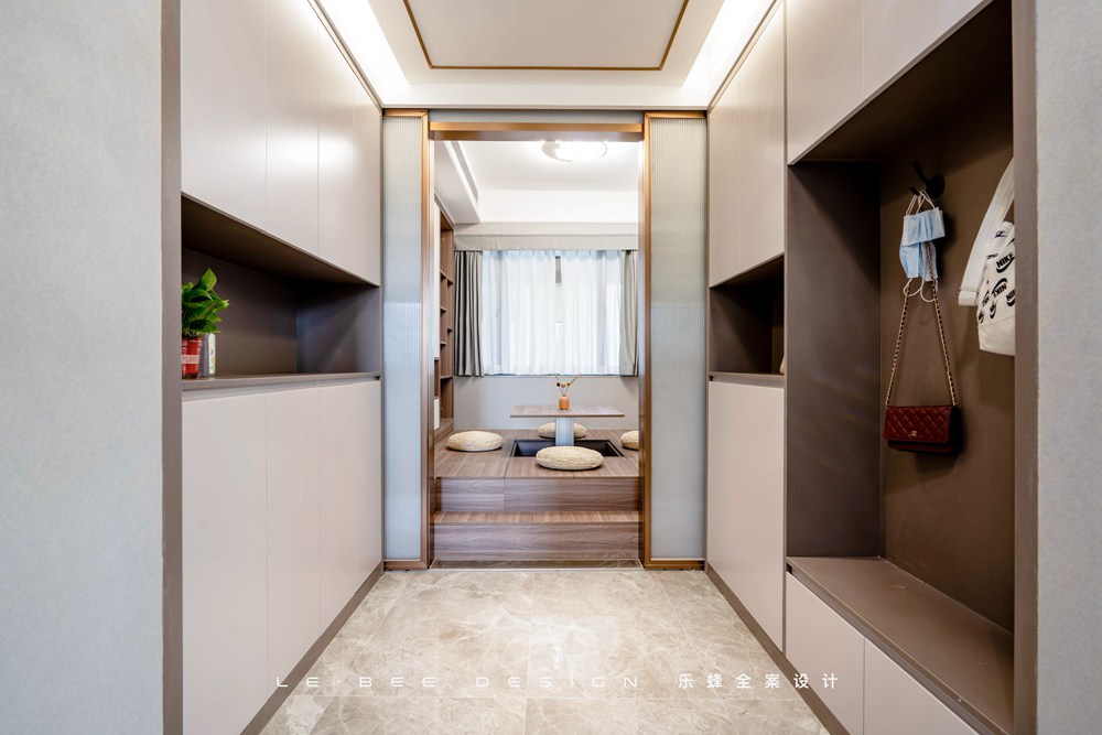 進門玄關空間較小,無法做玄關收納。于是設計師大膽想象,將房間的一半做成了鞋帽間,外套、鞋帽、包包一并收納。