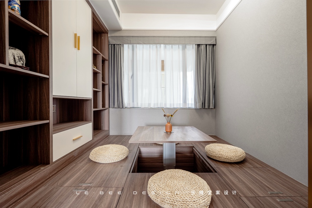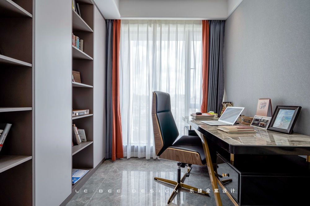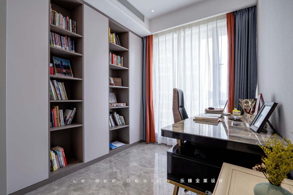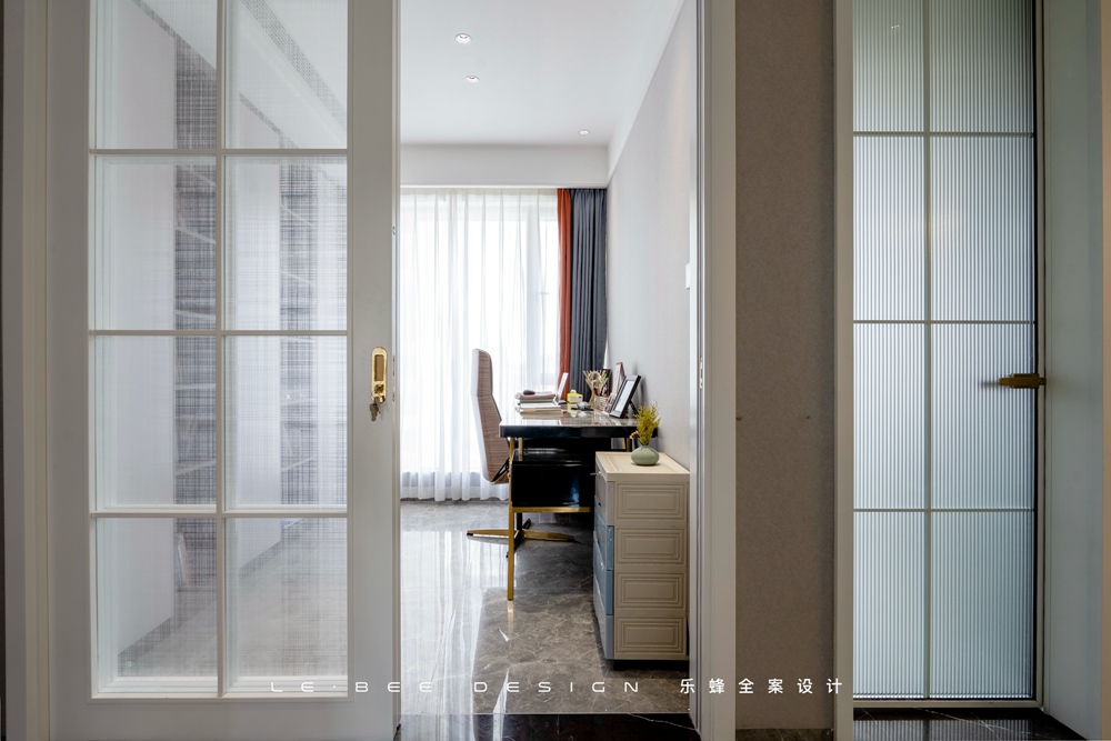 書房,承擔了屋主兩口日常換裝和辦公的重任,書柜門大量留白,讓房間在視覺上更透亮,柔和的白色窗簾,白色與書記煥發輕奢優雅光輝。