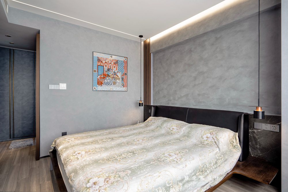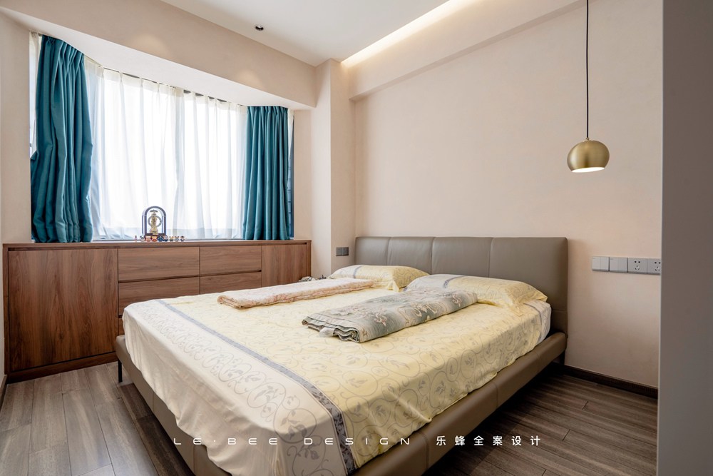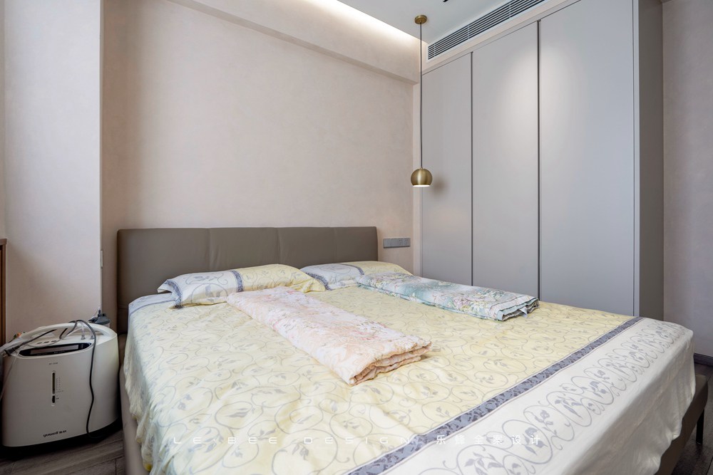 長輩房以米色為空間色彩的主調,床頭吊燈保障了老人家夜間行動的安全,同時能夠烘托室內的氛圍。