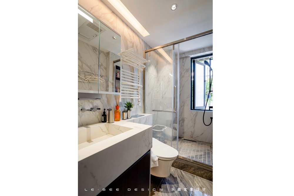 公區衛生間以淺色調為主,巖板的臺盆和壁掛式馬桶的貼磚面相齊平,頂面做防水的埃特板吊頂,結合筒燈和燈槽的燈光組合,讓整個空間都得到均勻的燈光覆蓋。
