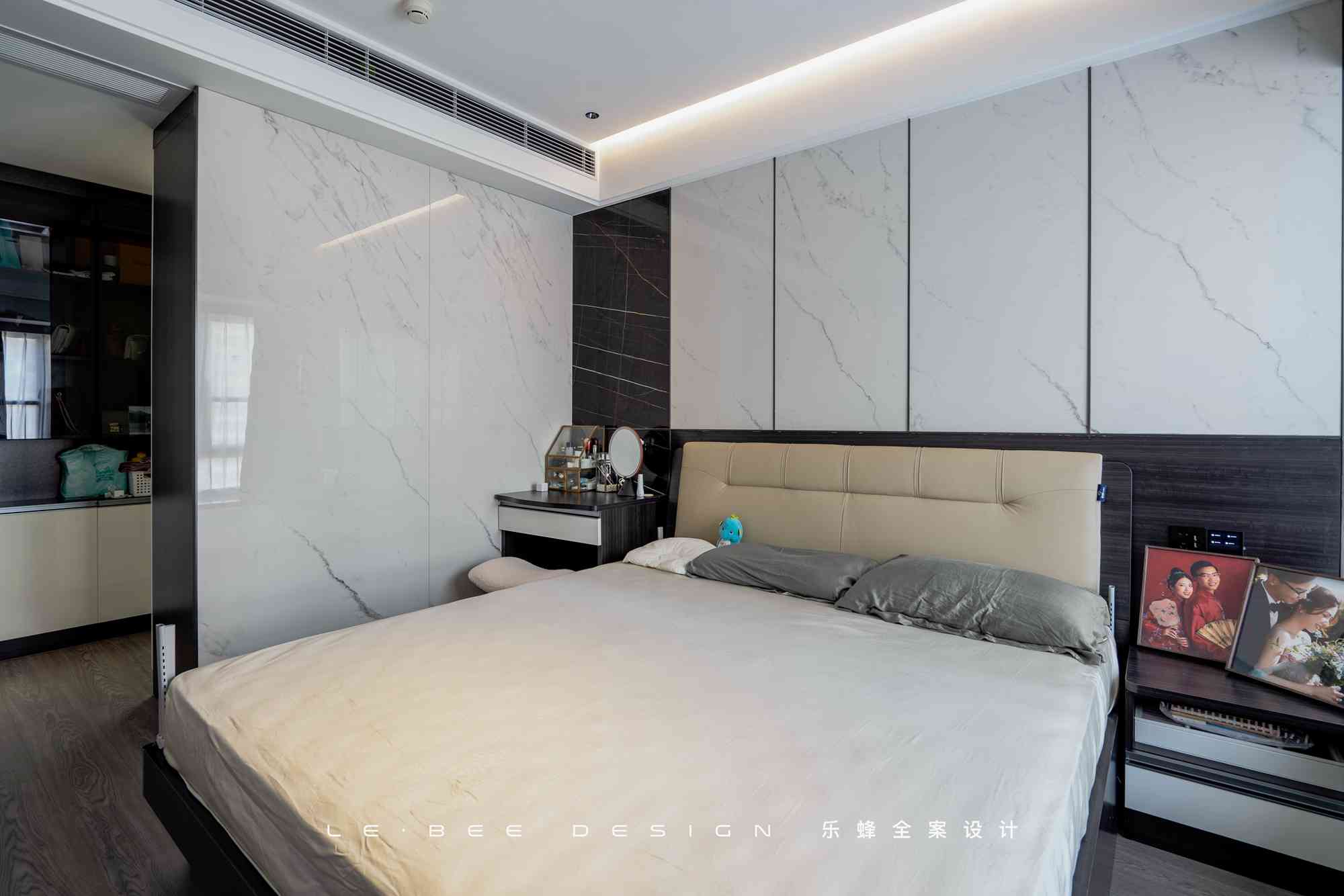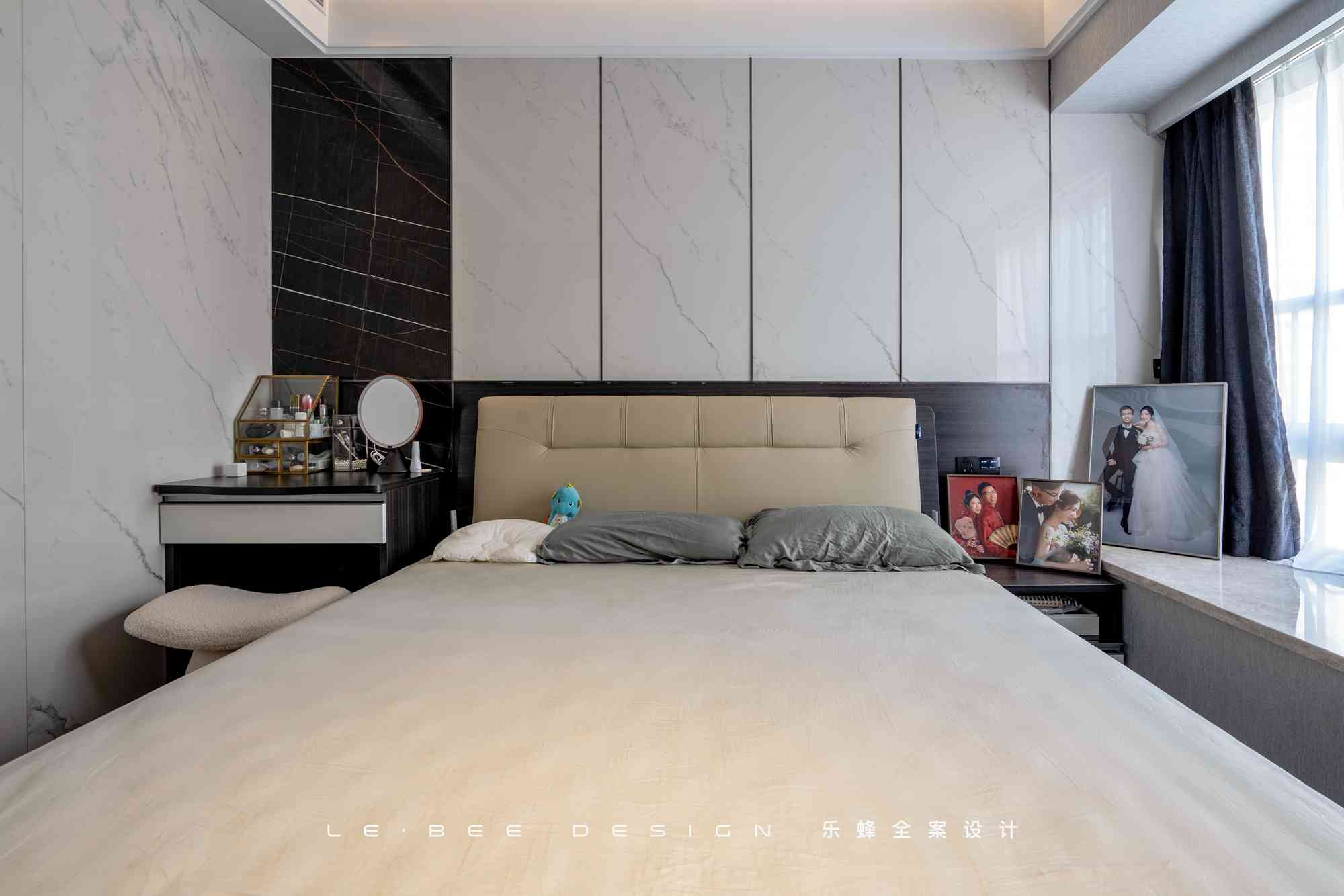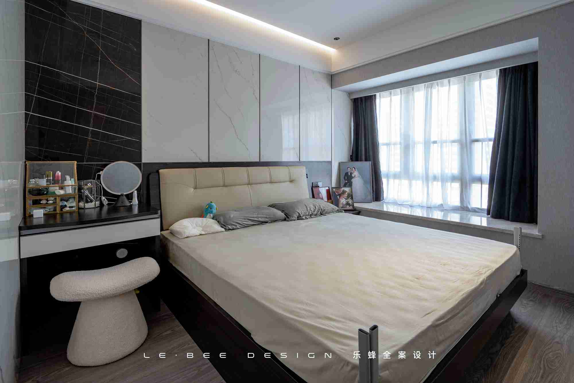 主臥睡眠區的布置比較簡約。接近樹皮色的木地板,能夠很好的烘托整個空間溫馨的氛圍,除了床頭背景墻之外,其他墻面都貼了墻布,好處就是防止墻面被弄臟,也更加耐磨,墻面不會留下瑕疵。
