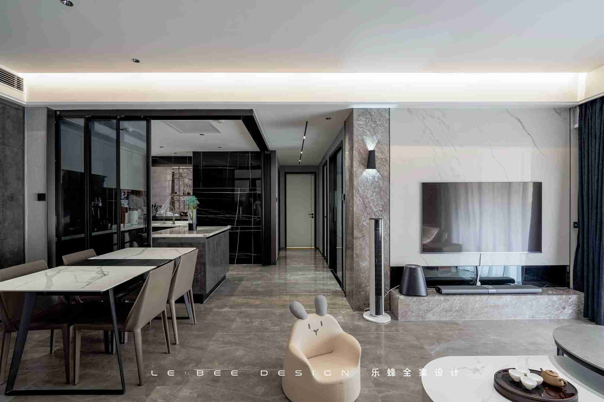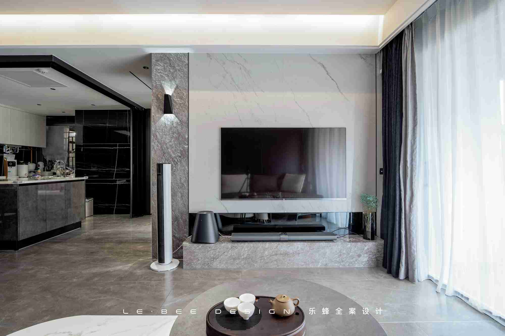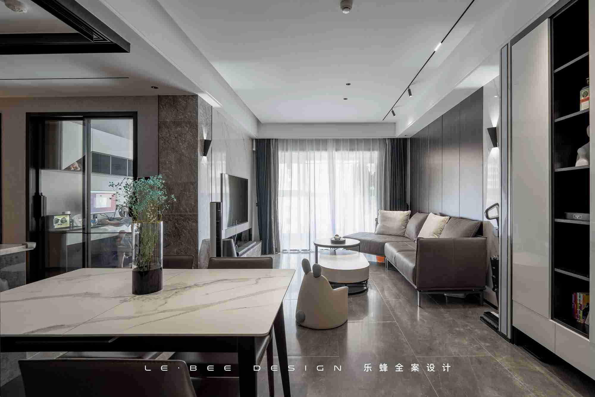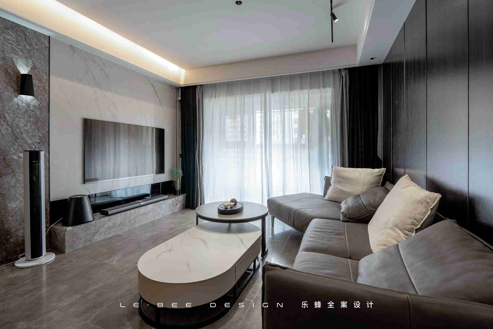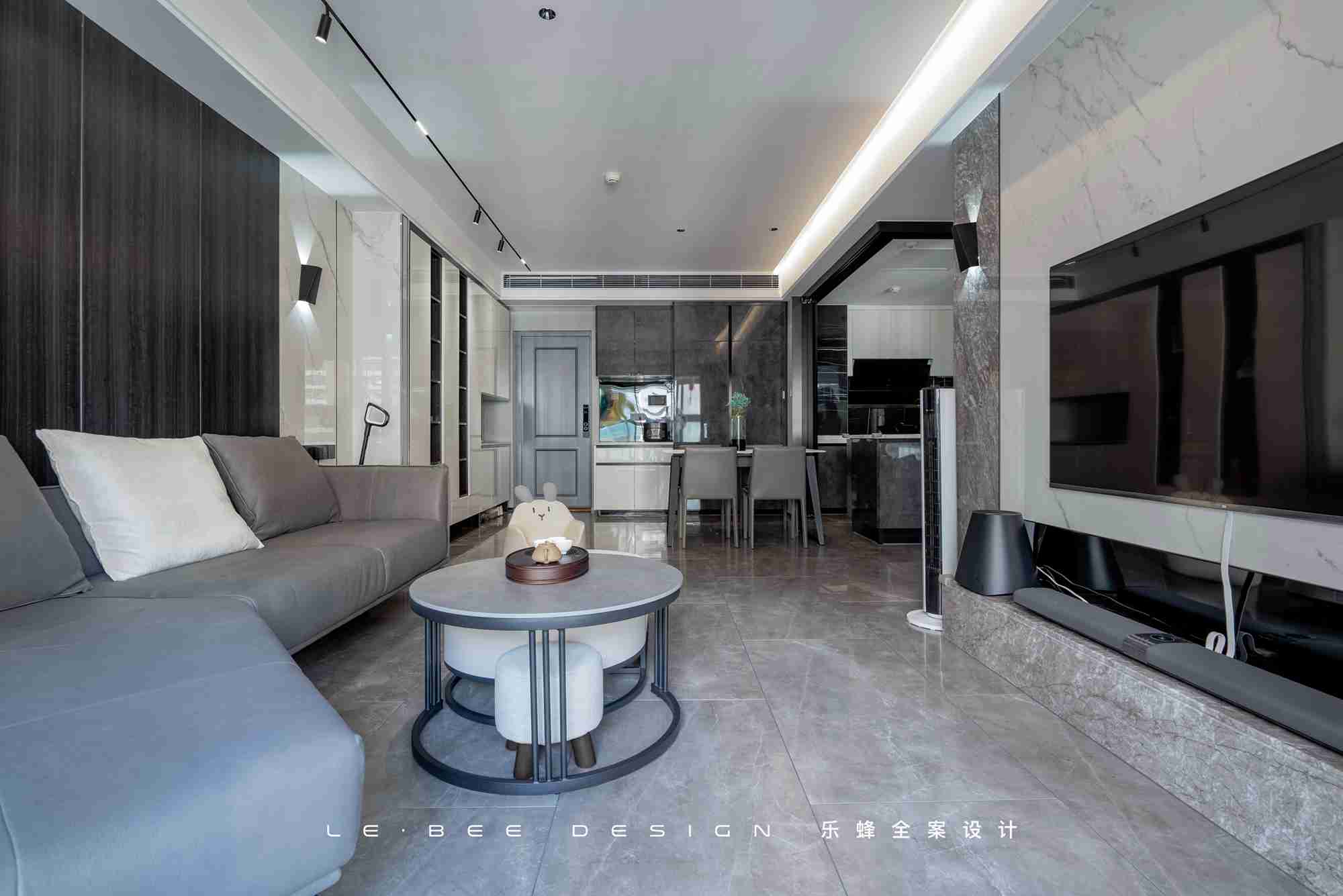 客廳整體采用黑白灰色調的設計,頂面采用無主燈吊頂,通過軌道射燈暗裝筒燈和暗藏燈帶的照明來營造氛圍。