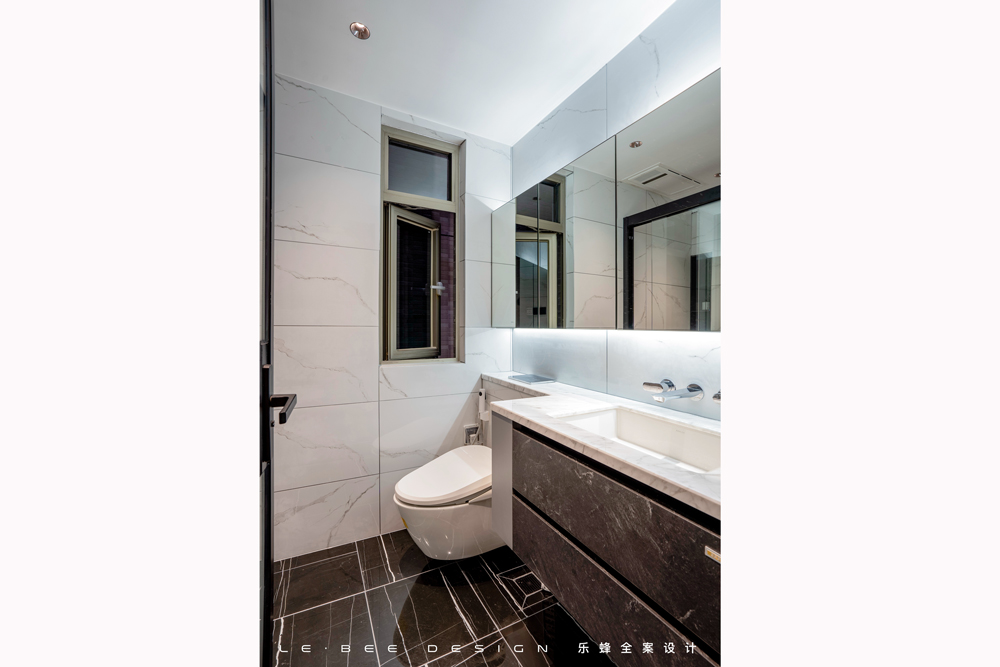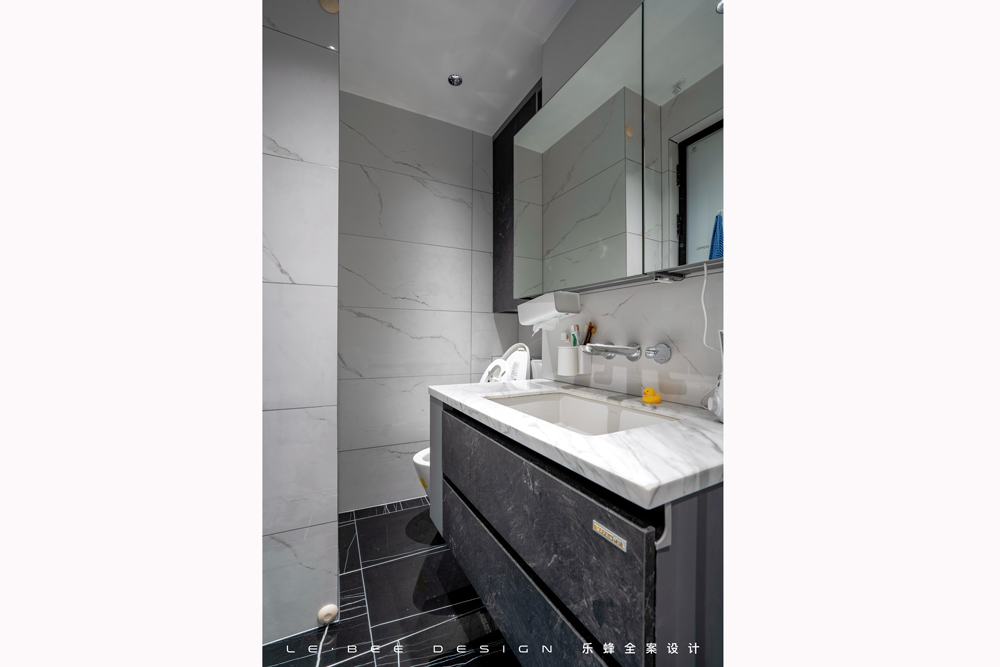 公區的衛生間采用了壁掛式馬桶的設計,在浴室柜的選用上,選擇了耐用性和美觀度更好的巖板浴室柜,水龍頭也提前規劃暗藏并且安裝在墻體里,保持臺面整潔。