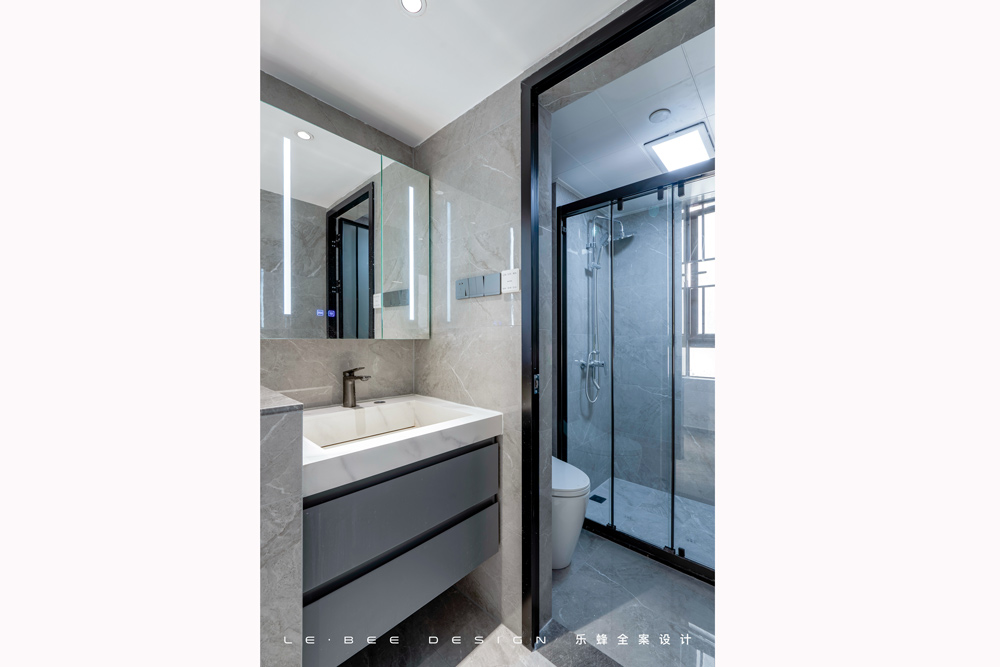 在主臥的衛(wèi)生間被改為衣帽間之后,公區(qū)衛(wèi)生間的干濕分離和洗手盆外置顯得尤為重要,帶燈光的鏡柜在滿足儲物的同時能提供輔助照明,增加照明多樣性。
