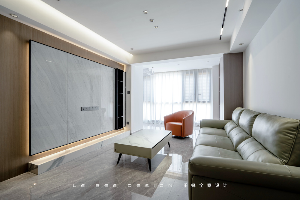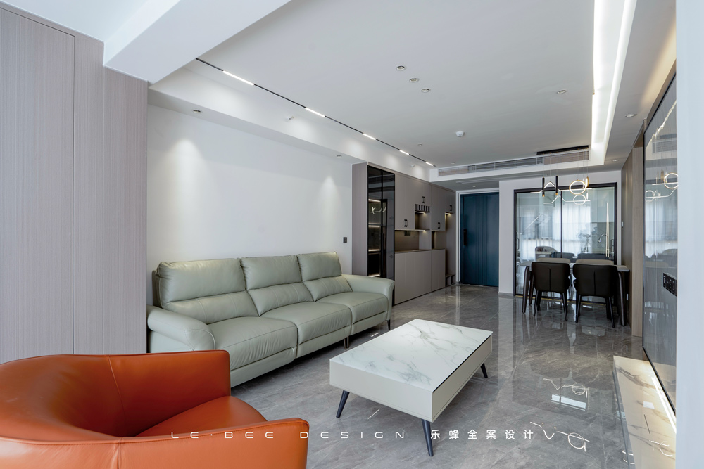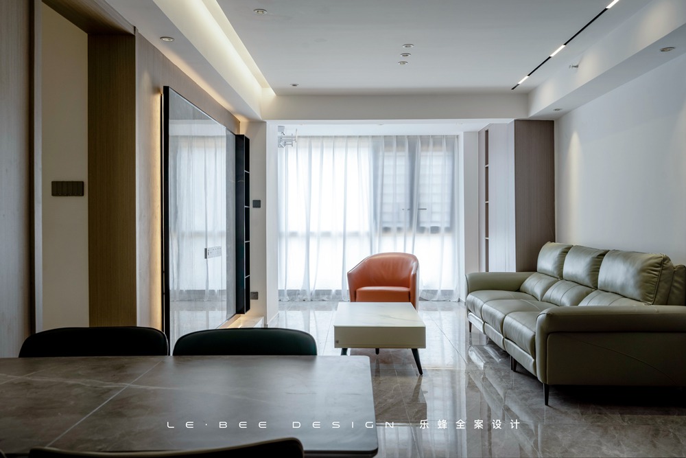 客廳沙發(fā)后期再通過掛畫裝飾一下,配合筒燈和磁吸軌道燈的光照來補(bǔ)充室內(nèi)的設(shè)計感,像這種客餐廳一體的戶型整體都比較方正,吊頂客餐廳一體的燈帶能有效的延伸視覺感,讓空間顯得更大,電視背景和餐廳背景做統(tǒng)一的木飾面營造出更多的高級感。通過木飾面和大幅瓷磚的搭配讓整個背景墻的材質(zhì)剛?cè)峤Y(jié)合,再配合暖光燈帶的烘托,家里便是溫暖的避風(fēng)港。