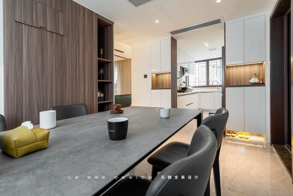 餐廳的采光非常獨特,通過白色窗紗透過來的光將整個空間點亮,灰色的地面瓷磚搭配深灰色的餐桌非常的簡約大氣;環繞四周的動線讓日常家庭聚會都變得非常的有序,有沖一杯咖啡或者茶,到這里享受午后的時光也是非常愜意的事情。