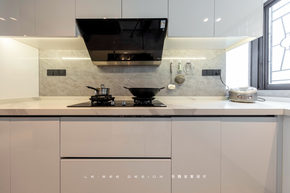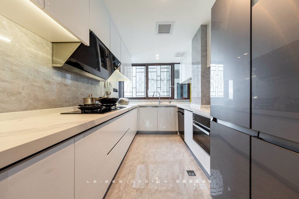 廚房U型的操作臺面給日常烹飪洗切炒的工序帶來了更多的操作空間,同時可以隨意擺放各種廚房用具,不再會受廚房空間的限制,冰箱也能放雙開門冰箱,保證日常冰箱儲物的需要得到滿足。