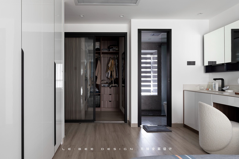 通過整合廚房和生活陽臺的空間,鞋柜區域設計在過道面向客廳的區域,來緩解過道的空曠感,主臥借用次臥的空間設計出衣帽間來滿足需求,主臥的洗手臺進行外置,和梳妝臺相結合。