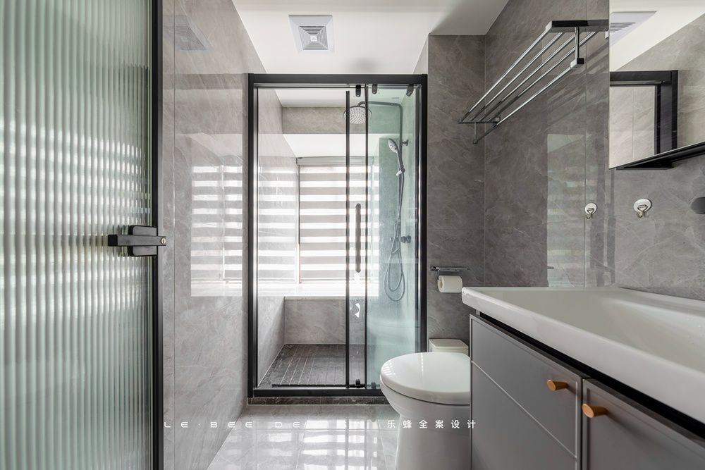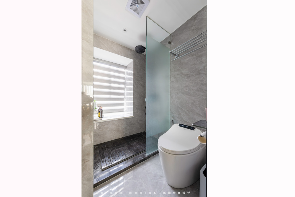 主臥衛生間沒有刻意強調明顯的干濕分離,在馬桶和淋浴的中間,我們豎了一塊玻璃,能有效的阻擋這一部分水飛濺出來,地面則是采用大理石拉槽的形式。在美觀程度和安全性能上都考慮得比較到位。
