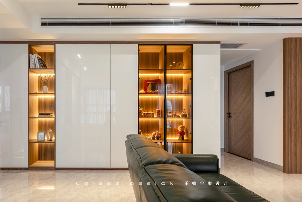 謝先生是一個很喜歡收藏的人,他對酒文化有比較濃厚的興趣,所以在面向客廳的整面柜子中,我們除了做白色門板,還做了幾扇透明玻璃的收藏柜,能夠隨時放置酒類、藝術品和裝飾品,通過和白色門板柜體的虛實結合,來滿足不同的儲物需求,白色門板的柜體可以用來儲藏一些日常用品、小孩子的玩具、不常使用的工具等等。