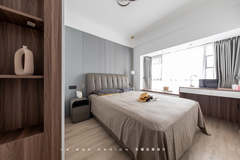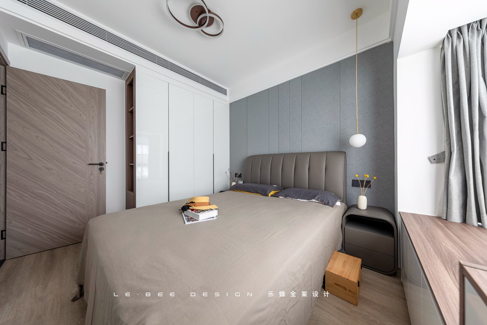 我們利用飄窗下面有限的空間,打造了一組收納和書桌組合的柜體形式,充分利用空間滿足使用需求,床頭的吊燈能夠結合空間帶來一些輔助照明的作用。