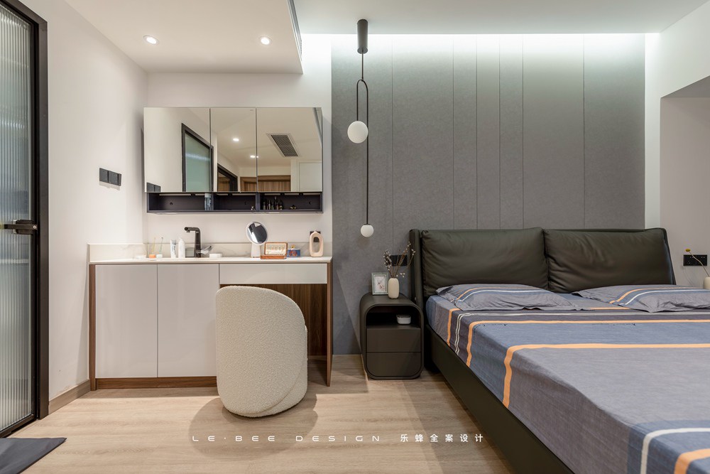 主臥同樣采用了時下比較火熱的無主燈照明形式,通過暗藏筒燈、燈帶和磁吸軌道燈加床頭吊燈的照明形式,作為主要的采光來源,同時對面的衣柜柜體除了做日常收納衣物使用,還開辟了一小塊用作展示的空間。通過燈光來做展示,輔助空間的照明。
