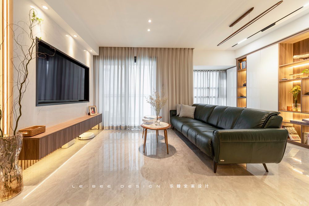 客廳屬于橫廳的布局形式。燈光照明上。沒有特別強調主燈的存在,而是更多利用磁吸軌道燈。和柜體的暖光燈帶來營造空間的氛圍。