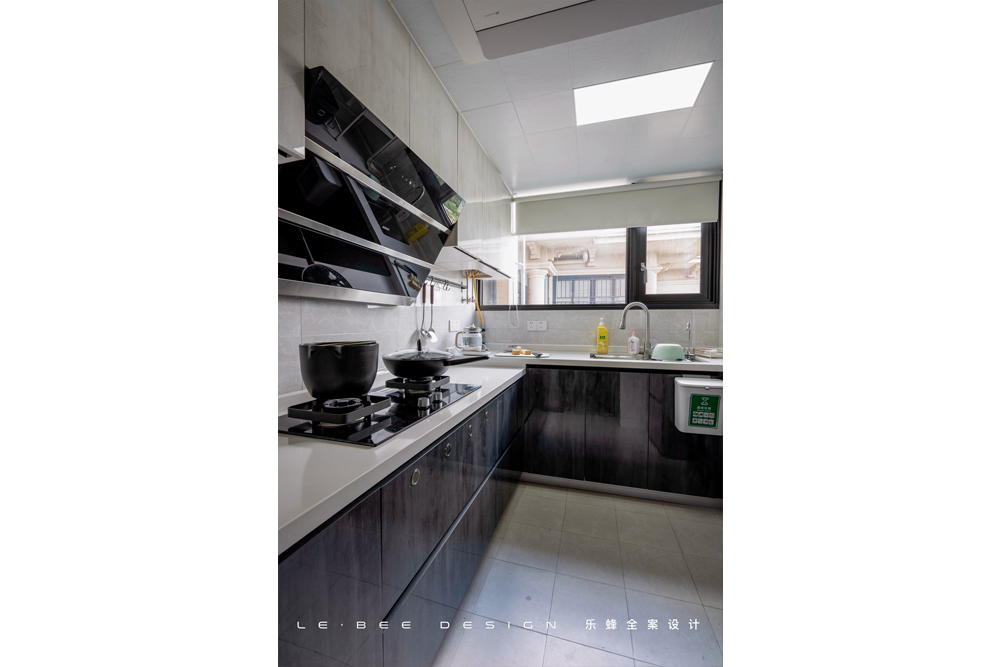 來到廚房,相比于原先狹窄的廚房空間,在轉移到新空間之后,櫥柜臺面能夠呈U型狀布置,在空間上也更加從容,水槽臺面和燃氣灶臺面根據操作的舒適高度設計了高低落差,使用更佳舒服。