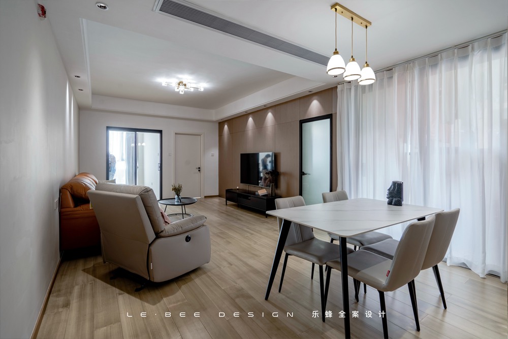 淺色的地板讓室內的光線不受過多的影響,餐邊的柜體合理分區來解決客餐廳區域的收納問題。